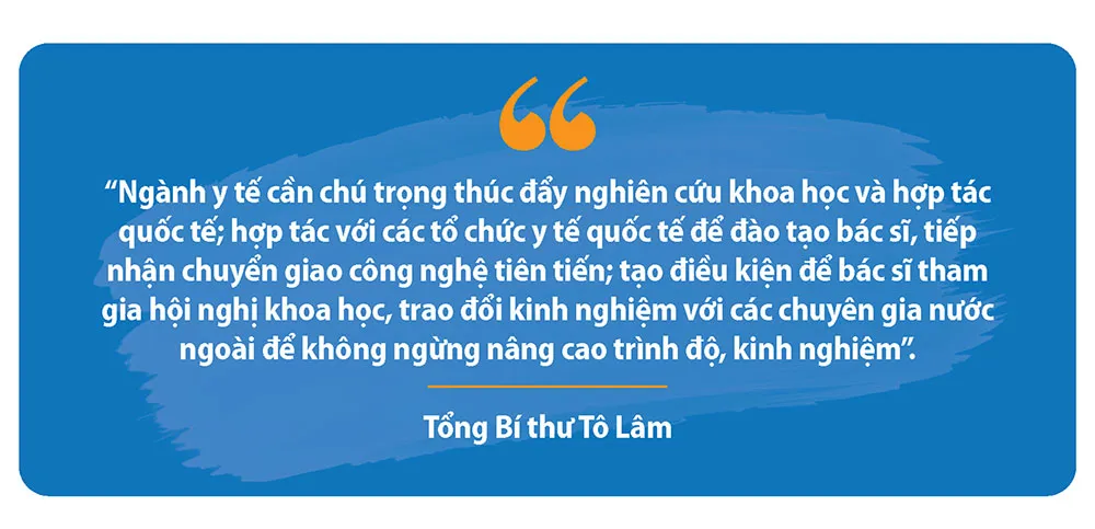 Tại buổi thăm và chúc mừng Bộ Y tế nhân dịp Ngày Thầy thuốc Việt Nam 27/2/2025, Tổng Bí thư Tô Lâm đề nghị Bộ Y tế chú trọng thúc đẩy nghiên cứu khoa học và hợp tác quốc tế; hợp tác với các tổ chức y tế quốc tế để đào tạo bác sĩ, tiếp nhận chuyển giao công nghệ tiên tiến; tạo điều kiện để bác sĩ tham gia hội nghị khoa học, trao đổi kinh nghiệm với các chuyên gia nước ngoài để không ngừng nâng cao trình độ, kinh nghiệm.
