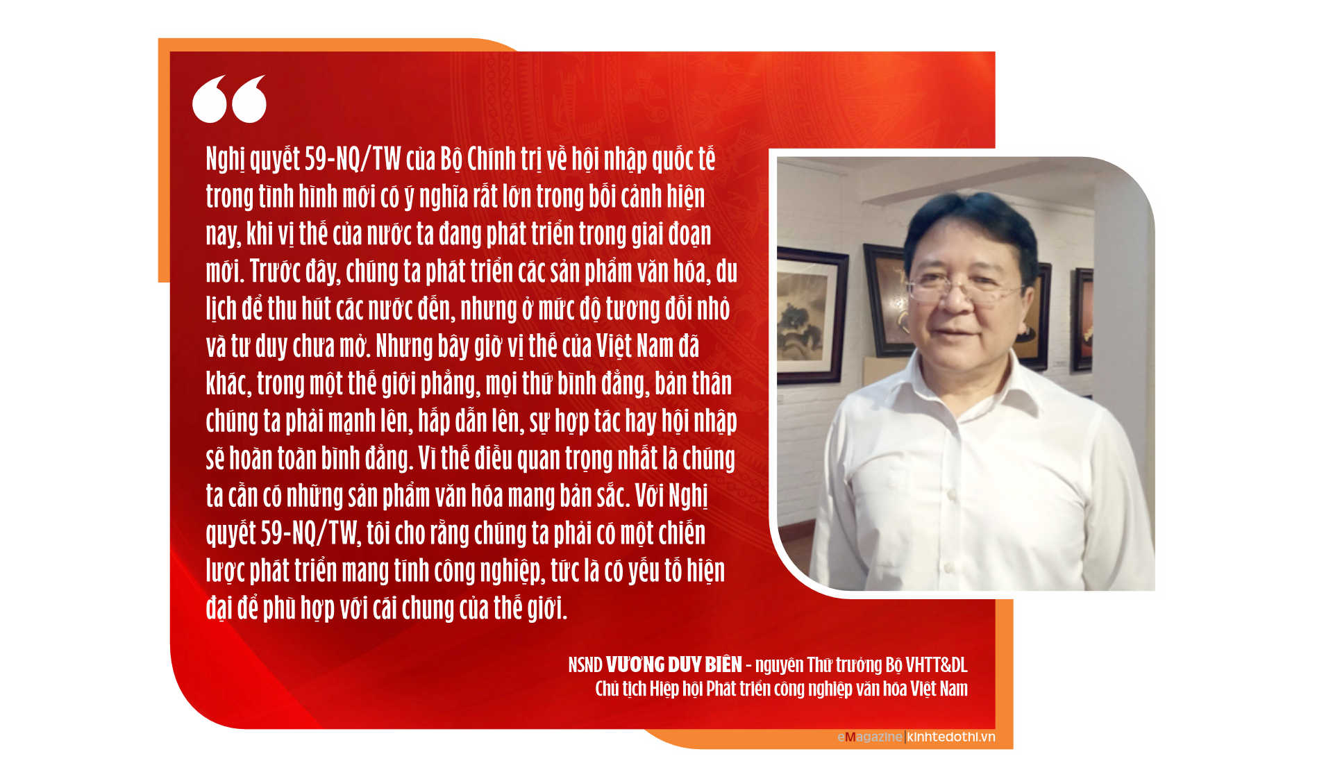 “Mặt khác, công nghiệp văn hóa cần đáp ứng tiêu chí hiện đại, đáp ứng được yêu cầu, thị hiếu của công chúng, nhất là khi chúng ta đang sống trong thời đại công nghệ số hóa, có thể chia sẻ văn hóa của Việt Nam tới mọi nơi trên thế giới, để thế giới có thể cảm nhận được giá trị văn hóa của Việt Nam” – NSND Nguyễn Xuân Bắc nói.