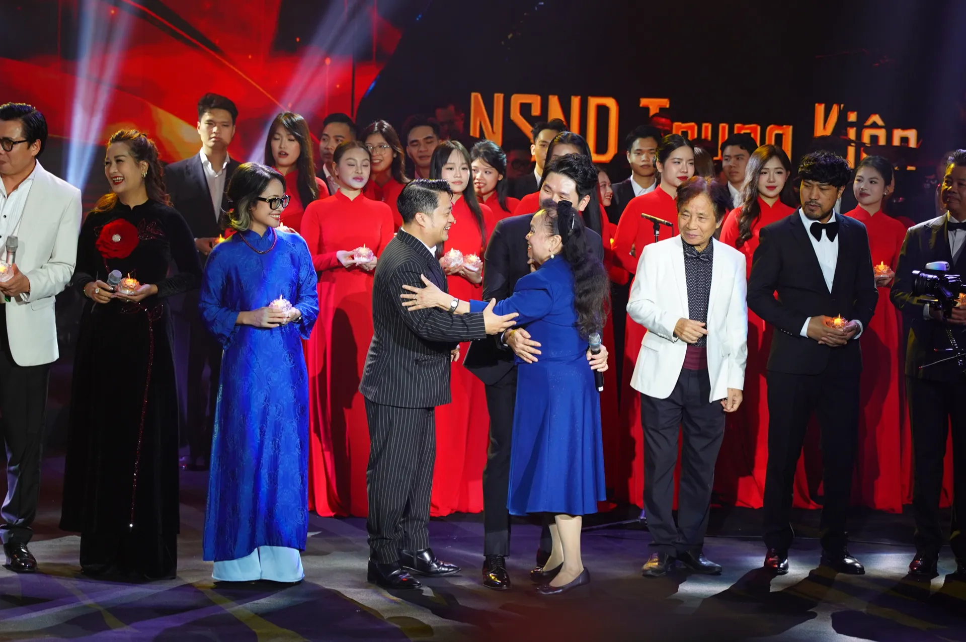 Trong khoảnh khắc nghẹn ngào ấy, vợ và con trai của cố GS.NSND Trung Kiên - NSND Trần Thu Hà và nhạc sĩ Quốc Trung - bước lên sân khấu, trao bó hoa tri ân và ôm cảm ơn từng nghệ sĩ tham gia chương trình. NSND Trần Thu Hà không giấu được nước mắt đón nhận tình cảm mà các thế hệ học trò dành cho chồng mình - những tình cảm vô cùng chân thành, đẹp đẽ và ấm áp.