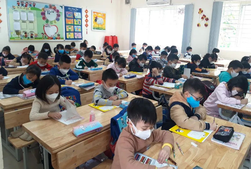 | Học sinh trường Tiểu học Kim Giang đeo khẩu trang trong lớp học |