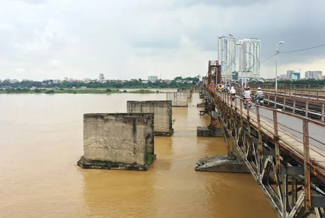 | Dù lũ thượng nguồn lên trên báo động, tuy nhiên mực nước sông Hồng tại Hà Nội vẫn dưới mức báo động 1 khá nhiều. Ảnh: Nước sông Hồng vẫn thấp, mố chân cầu Long Biên vẫn có thể nhìn thấy rõ vào trưa nay (21/8). |