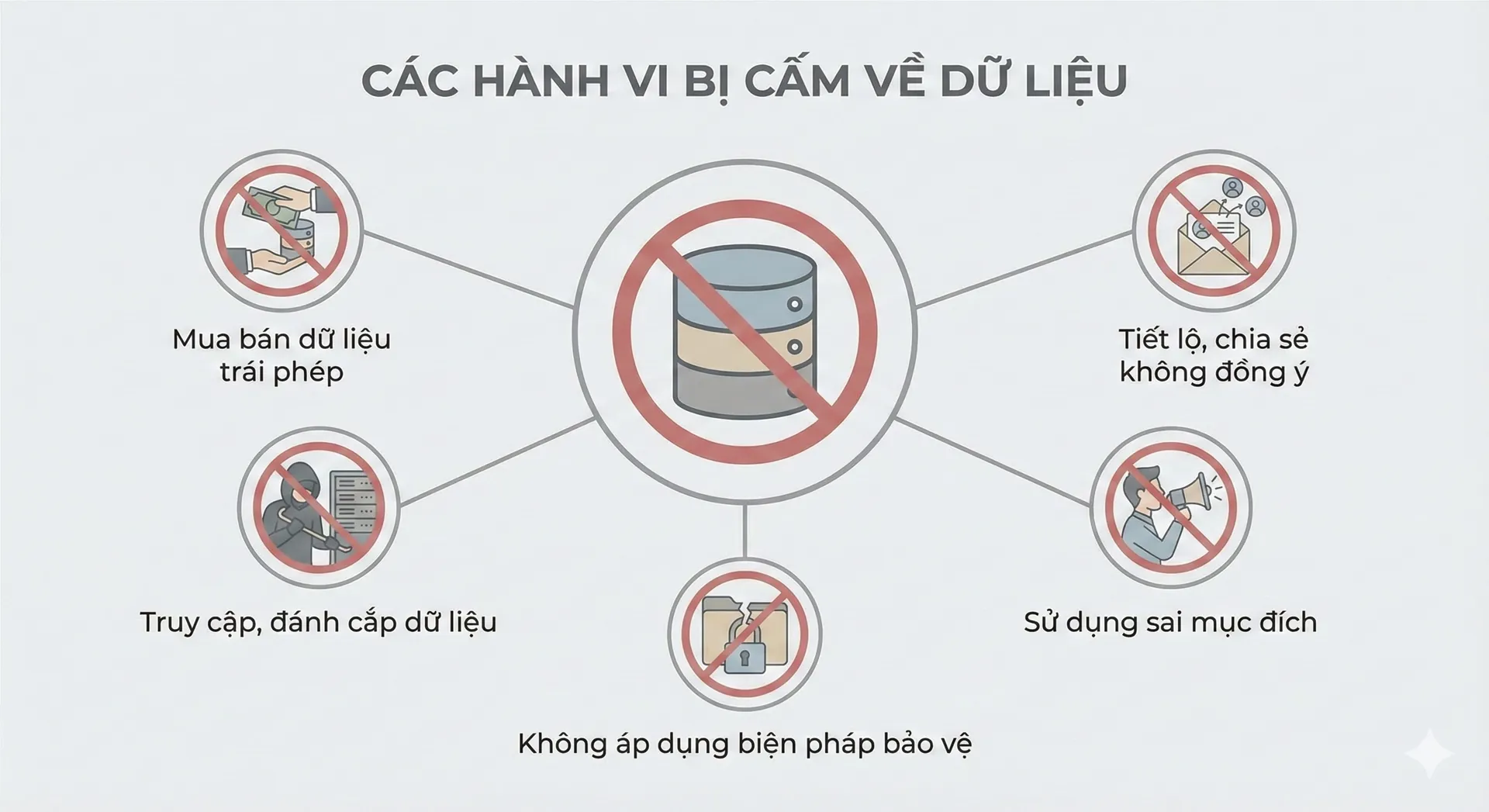 Theo quy định tại Điều 7 Luật Bảo vệ dữ liệu cá nhân, từ 01/01/2026, các hành vi bị nghiêm cấm gồm: Xử lý dữ liệu cá nhân nhằm chống lại Nhà nước Cộng hòa xã hội chủ nghĩa Việt Nam, gây ảnh hưởng đến quốc phòng, an ninh quốc gia, trật tự, an toàn xã hội, quyền, lợi ích hợp pháp của cơ quan, tổ chức, cá nhân; Cản trở hoạt động bảo vệ dữ liệu cá nhân; Lợi dụng hoạt động bảo vệ dữ liệu cá nhân để thực hiện hành vi vi phạm pháp luật; Xử lý dữ liệu cá nhân trái quy định của pháp luật; Sử dụng dữ liệu cá nhân của người khác, cho người khác sử dụng dữ liệu cá nhân của mình để thực hiện hành vi trái quy định của pháp luật; Mua, bán dữ liệu cá nhân, trừ trường hợp luật có quy định khác và Chiếm đoạt, cố ý làm lộ, làm mất dữ liệu cá nhân.