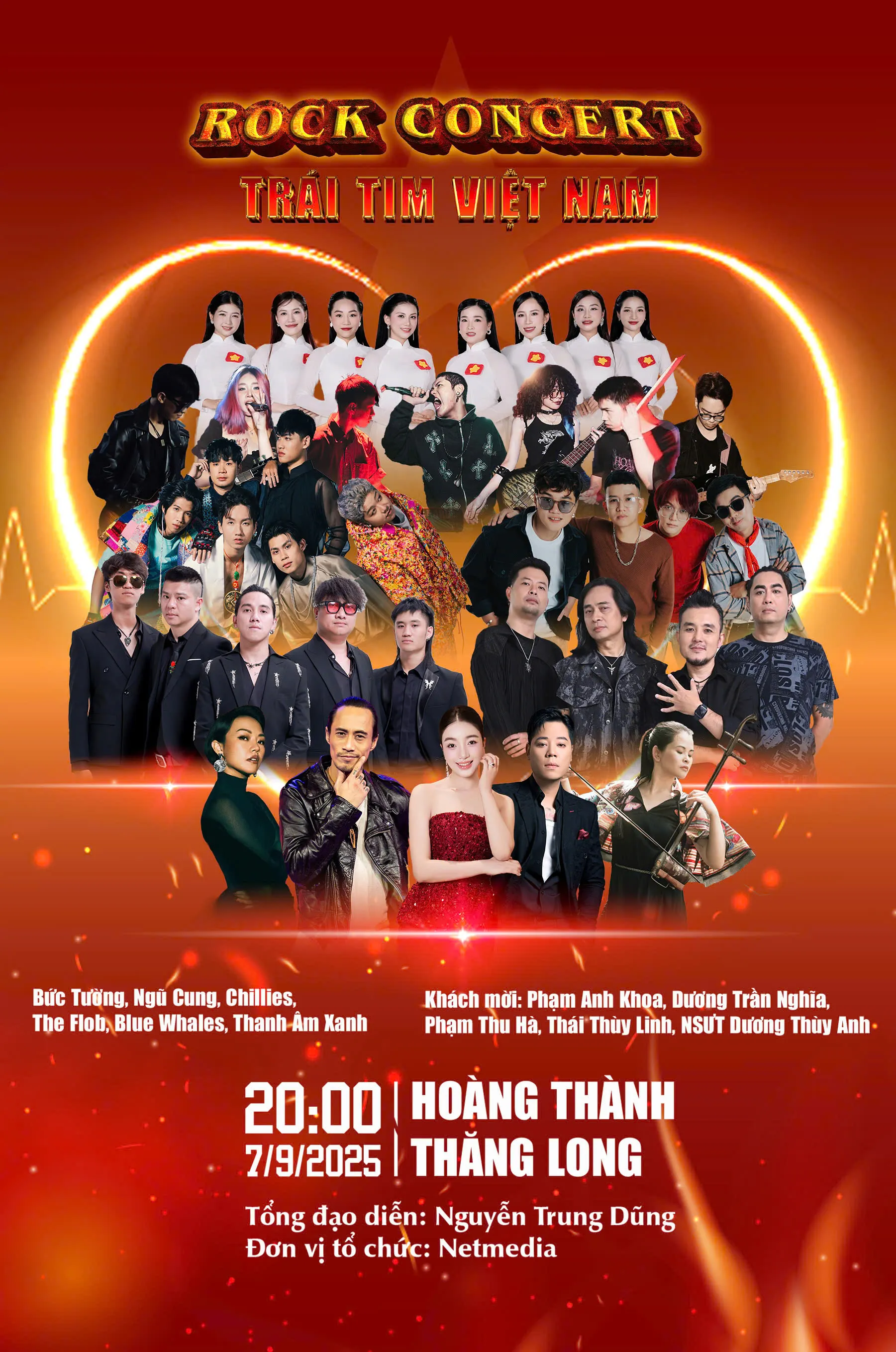 Chương trình “Rock Concert – Trái tim Việt Nam” sẽ diễn ra với sự góp mặt của các ban nhạc hàng đầu Việt Nam như Bức Tường, Ngũ Cung, Chillies, The Flob, Blue Whales, cùng các ca sĩ khách mời như Phạm Anh Khoa, Phạm Thu Hà, Dương Trần Nghĩa… Đây không chỉ là một đại nhạc hội rock quy mô lớn, mà còn là nơi hội tụ của khát vọng tuổi trẻ, niềm tự hào dân tộc và tình yêu Tổ quốc được thăng hoa bằng âm nhạc.