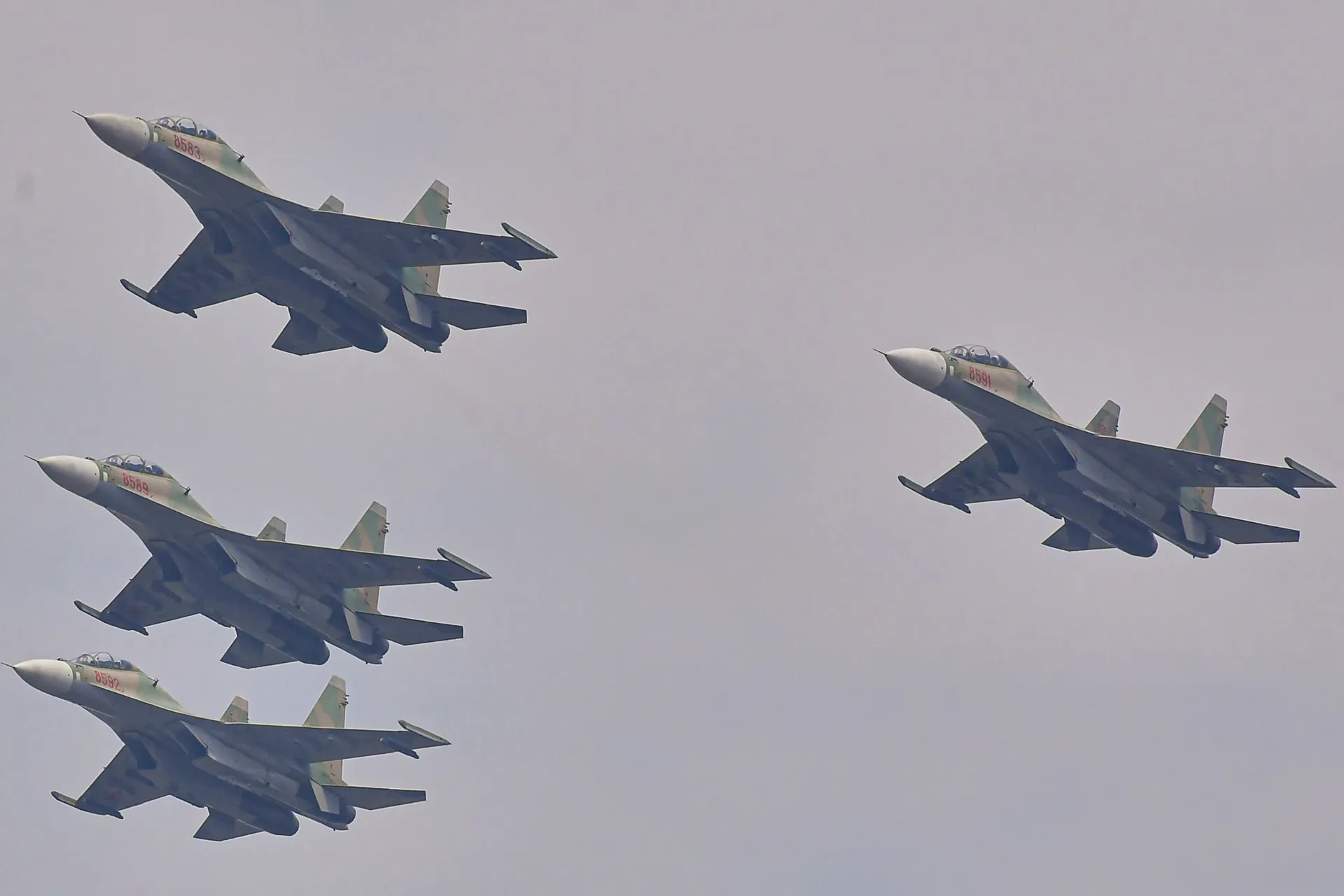 Mãn nhãn máy bay Su-30MK2 tiêm kích"gầm rú" trình diễn trên bầu trời Hà Nội