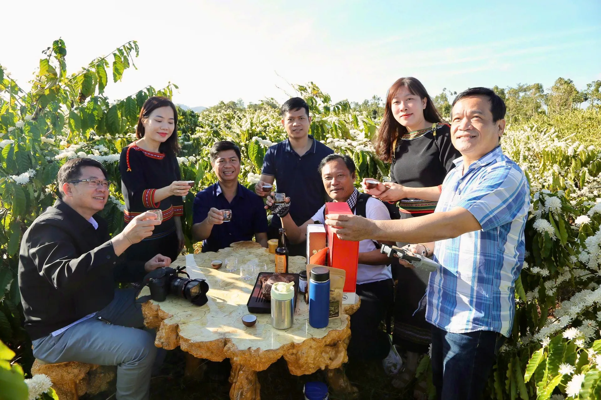 “Hoa nở đều, đậu nhụy tốt là coi như nắm chắc phần thắng trong tay” - ông Lê Văn Vương – Giám đốc Công ty TNHH Sản xuất và Thương mại Vương Thành Công (phường Ea Kao, tỉnh Đắk Lắk) phấn khởi chia sẻ khi nhìn những cành cà phê trắng muốt tại vùng nguyên liệu của công ty.