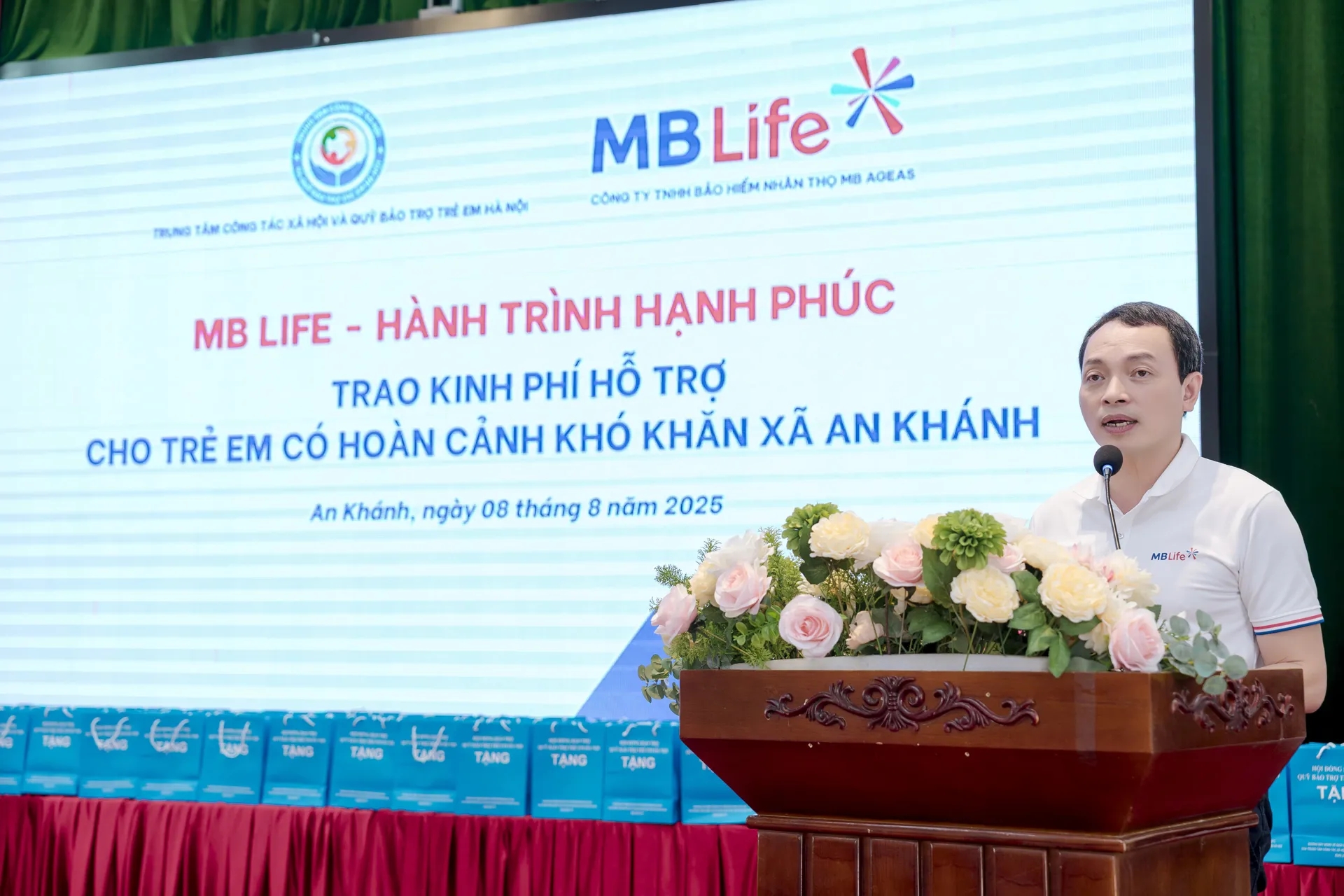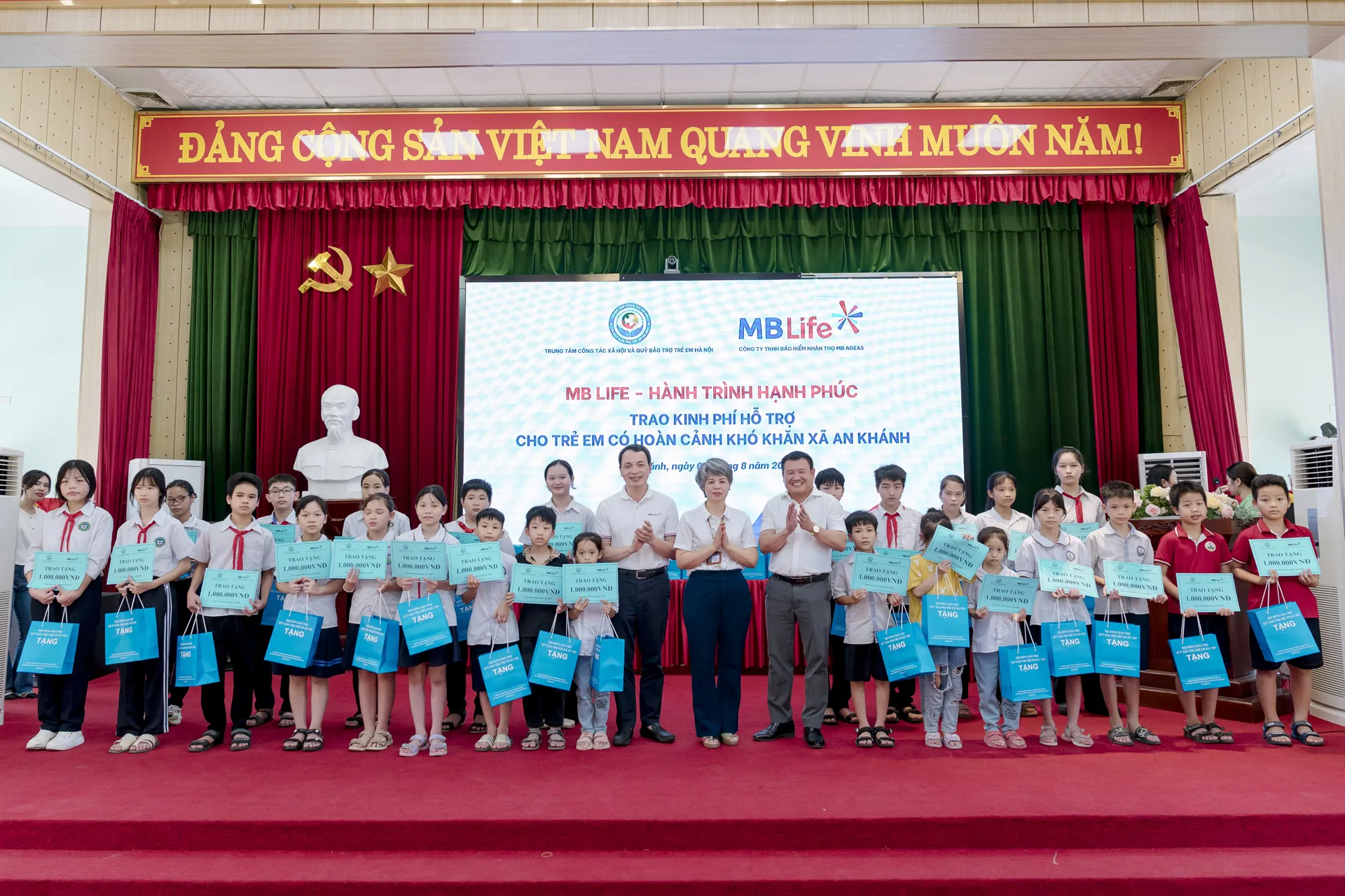 Theo đó, Công ty TNHH Bảo hiểm nhân thọ MB Ageas (MB Life) phối hợp với Trung tâm Công tác xã hội và Quỹ Bảo trợ trẻ em Hà Nội tổ chức chương trình “MB Life – Hành trình hạnh phúc” - trao kinh phí hỗ trợ cho các em có hoàn cảnh khó khăn của thuộc xã Sóc Sơn và xã An Khánh, TP Hà Nội.