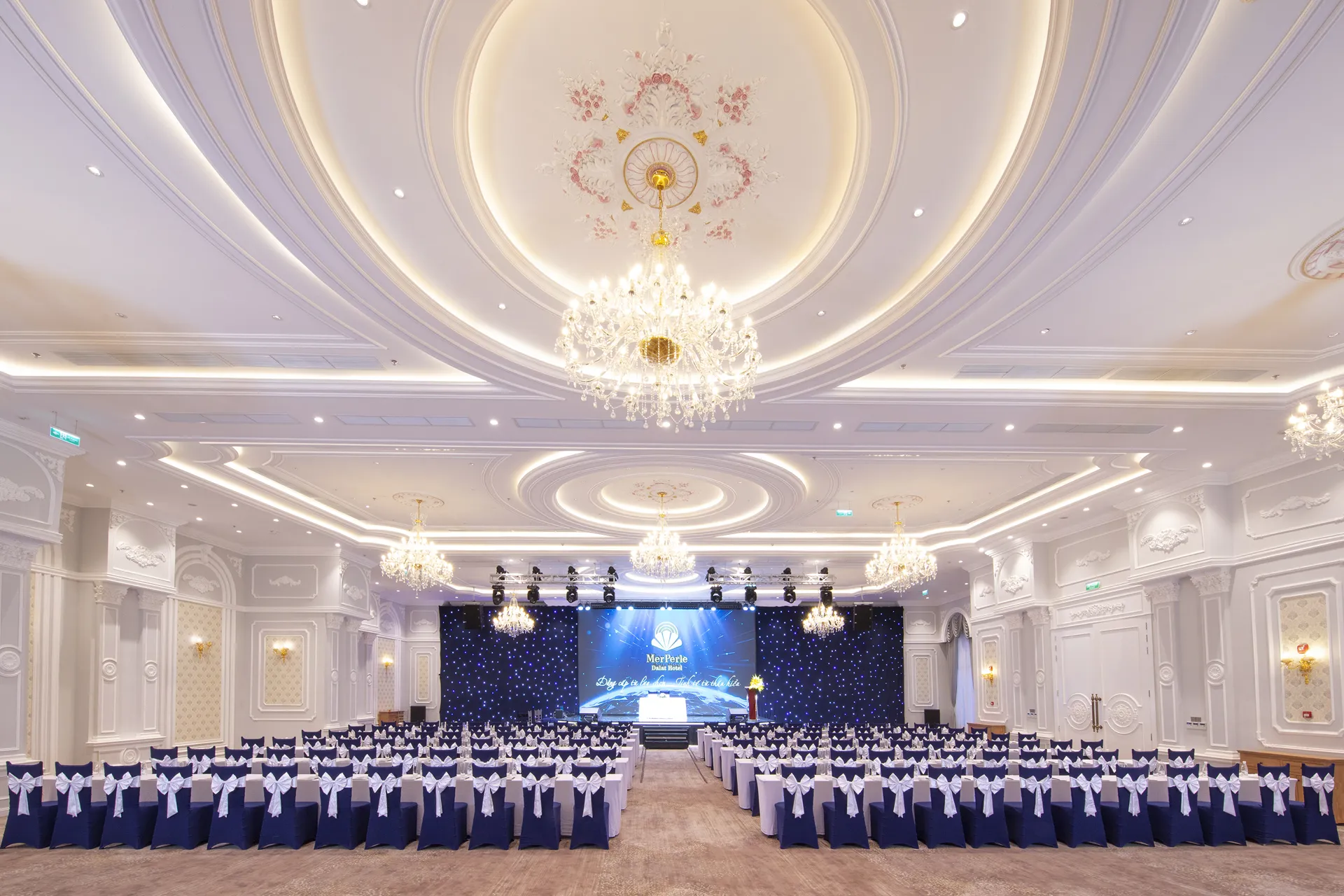 Sở hữu hơn 2.000 m2 dành cho các sự kiện và triển lãm trong nhà, MerPerle Dalat Hotel có 2 đại sảnh lớn và các sảnh từ vừa đến nhỏ có khả năng phục vụ từ 30 đến 1.500 khách cùng lúc.
