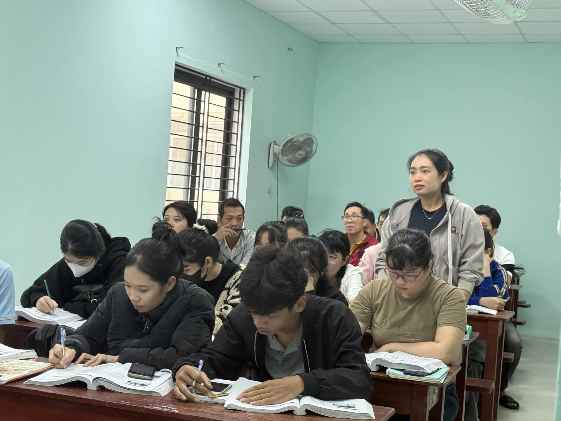 Chị Đinh Thị Linh (đứng) đang học lớp tiếng Hàn Quốc.