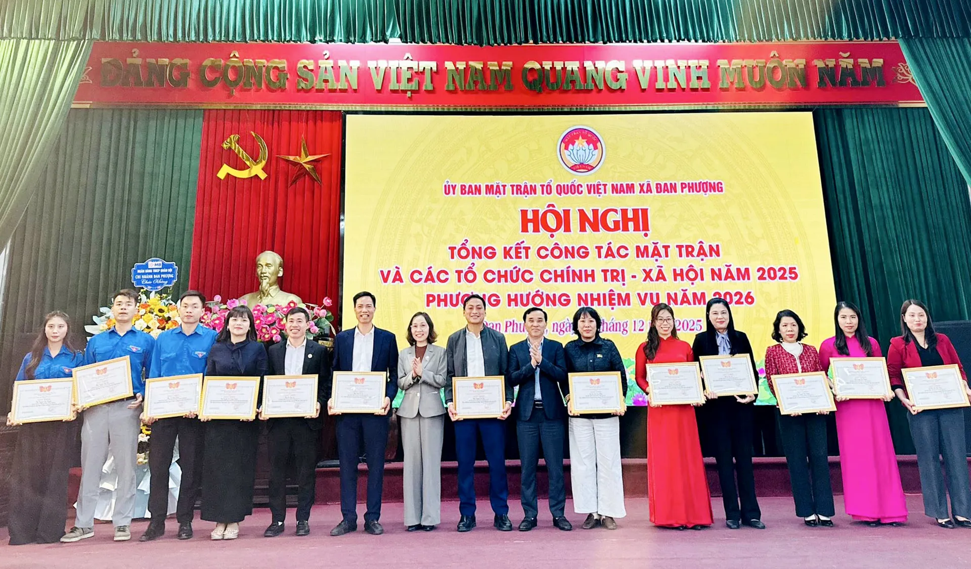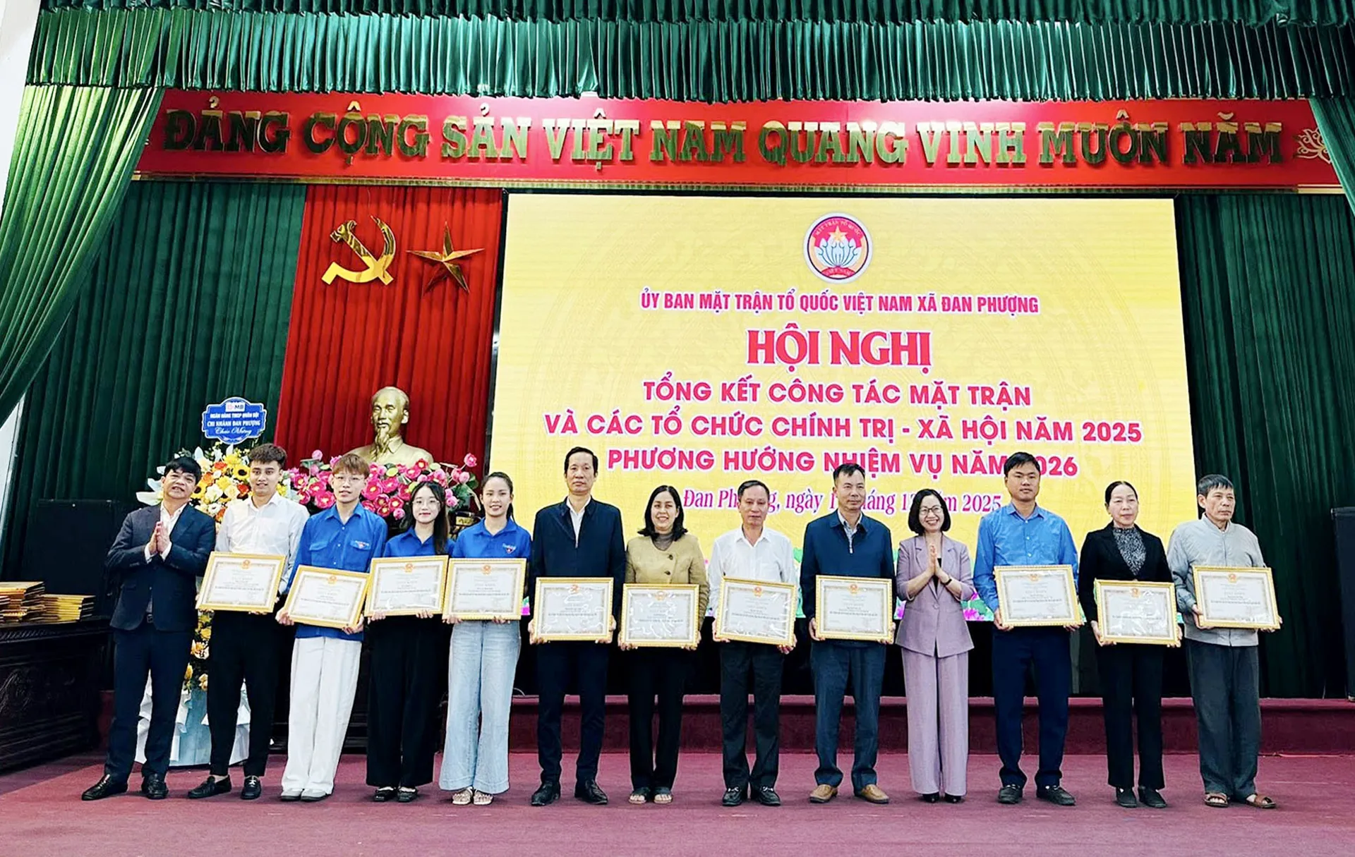 Tại hội nghị UBND xã Đan Phượng đã khen thưởng 19 tập thể, 22 cá nhân có thành tích xuất sắc trong việc thực hiện nhiệm vụ công tác MTTQ và các tổ chức chính trị - xã hội năm 2025. Ủy ban MTTQ xã đã khen thưởng 11 tập thể, 23 cá nhân có thành tích xuất sắc trong việc thực hiện nhiệm vụ năm 2025.
