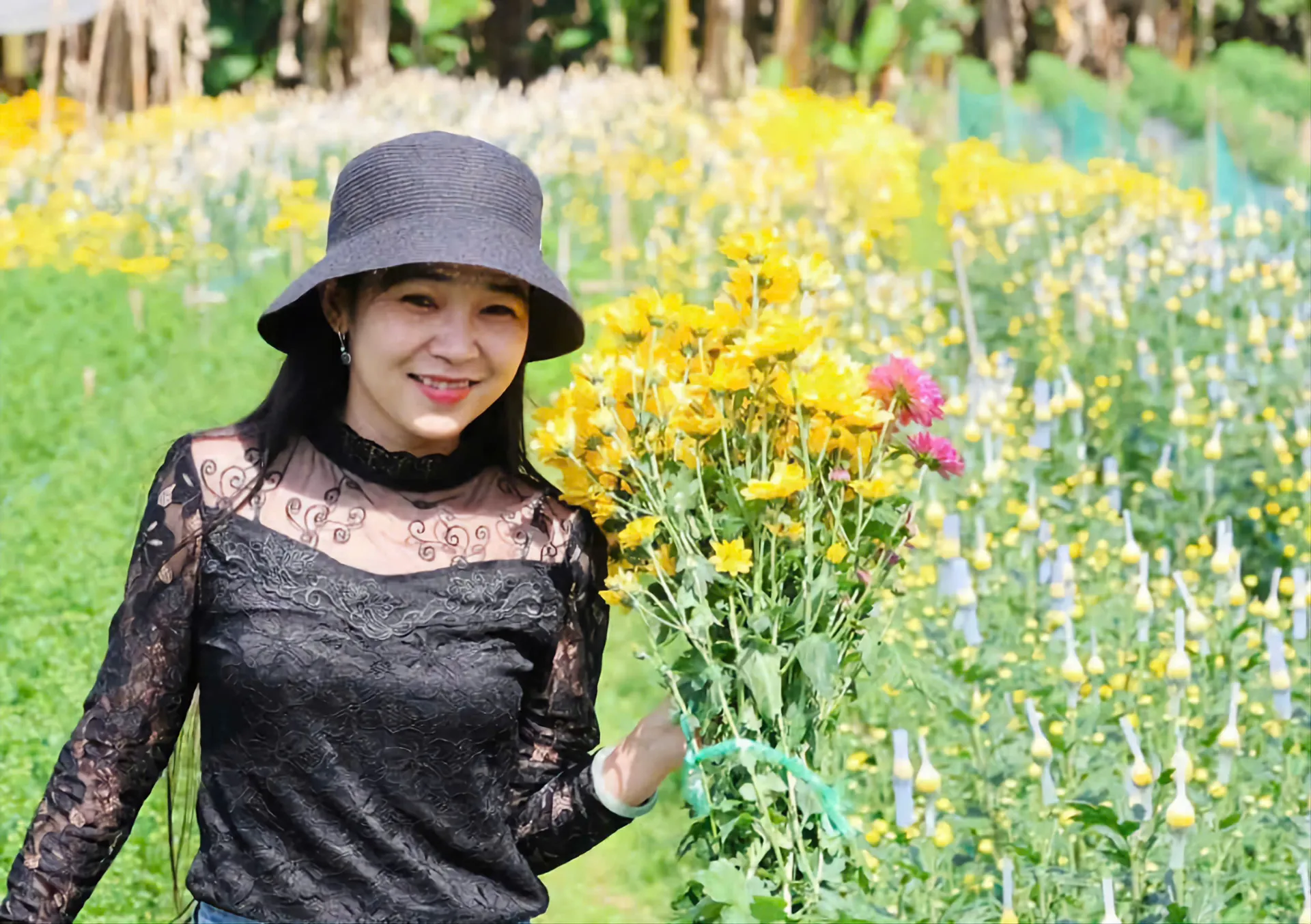 Trên mảnh đất hơn 300 m² vườn nhà, bà Ngọc từng trồng nhiều giống cúc Đà Lạt khác nhau. Năm nay, bà thử sức với giống cúc mai cam. Một số luống đã bắt đầu cho thu hoạch, hoa vàng đậm, cánh to, khỏe, được thị trường ưa chuộng.