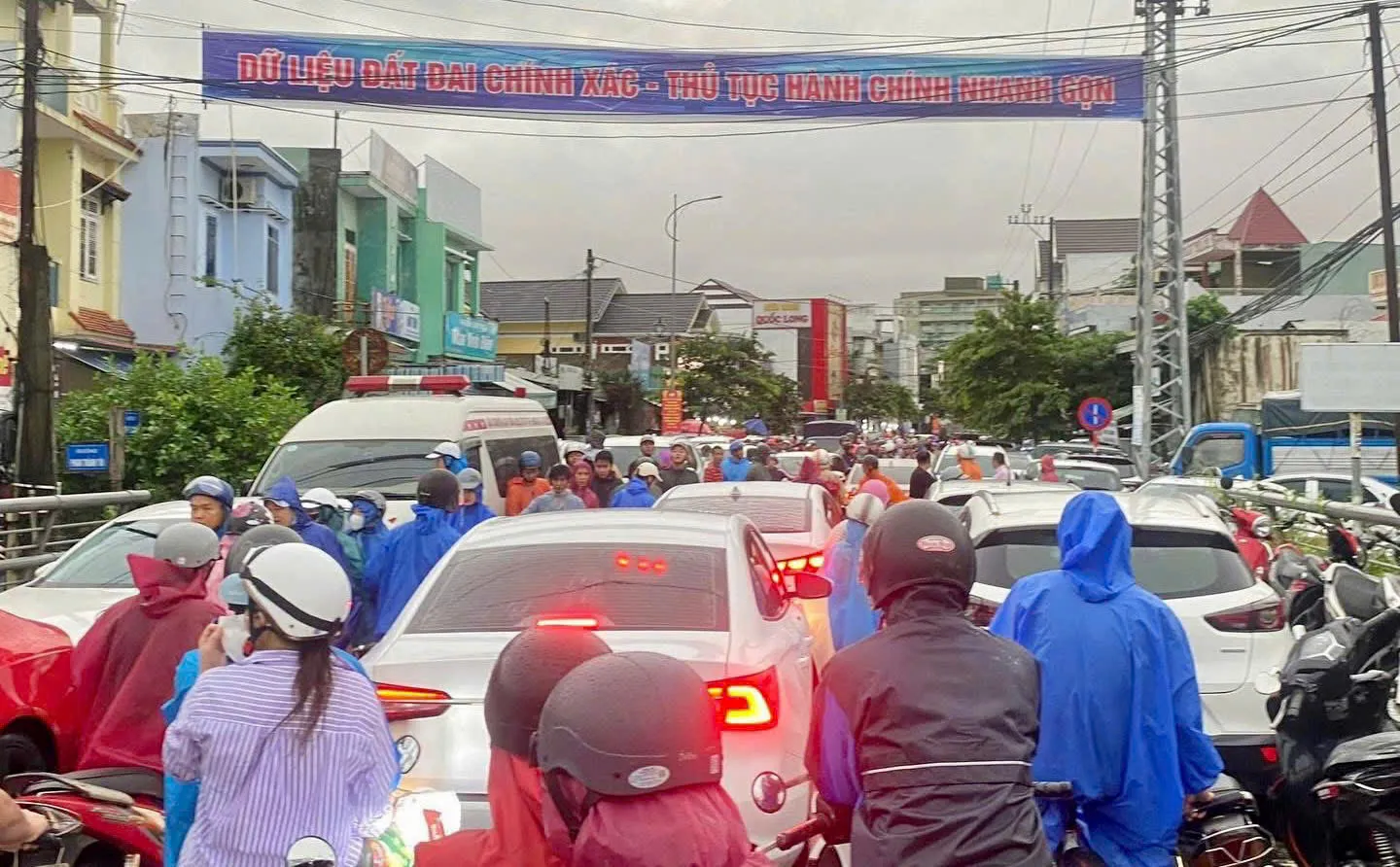 Đoạn đi qua Vĩnh Điện nước đang lên, người dân đi lại khó khăn nên giao thông ùn tắc.