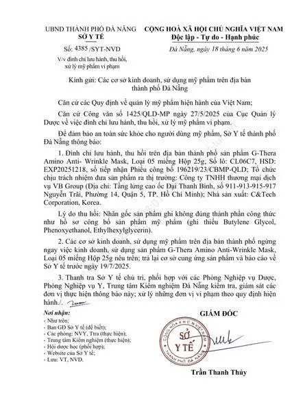 Theo Quyết định số 4385/SYT-NVD, ban hành ngày 20/6, Sở Y tế Đà Nẵng yêu cầu các cơ sở kinh doanh, sử dụng mỹ phẩm trên địa bàn thành phố ngừng ngay việc kinh doanh, sử dụng sản phẩm G-Thera Amino Anti-Wrinkle Mask (loại 5 miếng, hộp 25g, số lô: CL06C7, hạn dùng: 18/12/2025), do nhãn gốc ghi không đúng thành phần công thức như hồ sơ công bố. Cụ thể, sản phẩm thiếu các thành phần Butylene Glycol, Phenoxyethanol, Ethylhexylglycerin.