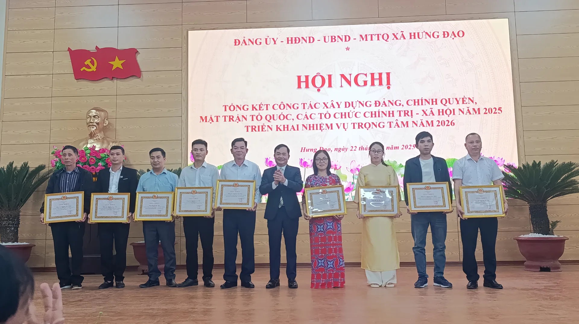 Tại hội nghị, xã Hưng Đạo đã khen thưởng nhiều tập thể và cá nhân có thành tích tiêu biểu trong công tác xây dựng Đảng, chính quyền và các phong trào thi đua năm 2025, qua đó kịp thời động viên, khích lệ cán bộ, đảng viên và Nhân dân tiếp tục nỗ lực hoàn thành tốt nhiệm vụ trong thời gian tới.