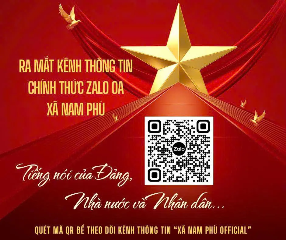Ấn phẩm truyền thông giới thiệu kênh Zalo OA được thiết kế trang trọng với tông màu đỏ và vàng kim chủ đạo – biểu trưng cho tinh thần cách mạng và niềm tự hào dân tộc. Trung tâm là hình ảnh ngôi sao vàng năm cánh tỏa sáng, khẳng định vai trò lãnh đạo thống nhất của Đảng và Nhà nước. Hình ảnh những cánh chim bồ câu được lồng ghép khéo léo tạo sự hài hòa trong bố cục, gửi gắm thông điệp về hòa bình, ấm no và khát vọng vươn lên của người dân Nam Phù trong thời đại mới.