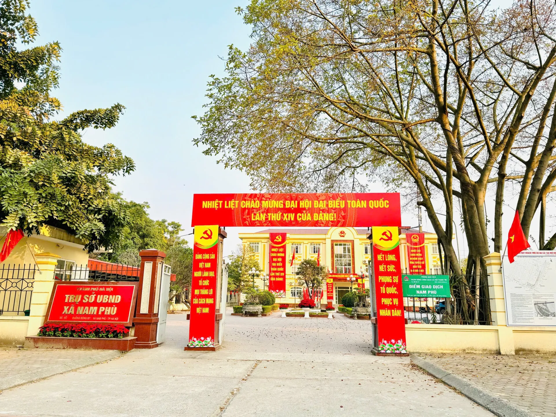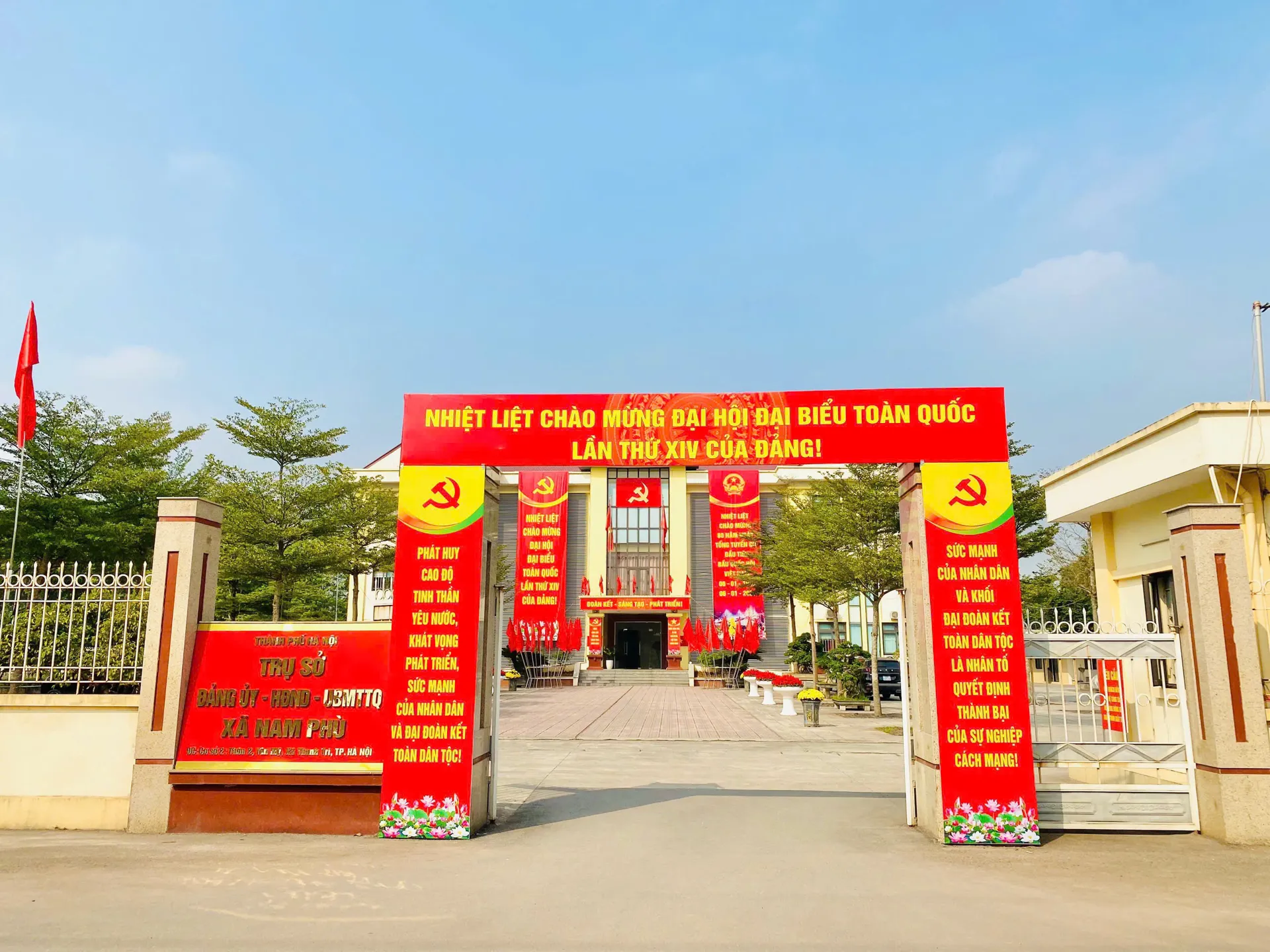 Trụ sở Đảng ủy xã Nam Phù rực rỡ sắc cờ chào mừng Đại hội Đảng toàn quốc lần thứ XIV.