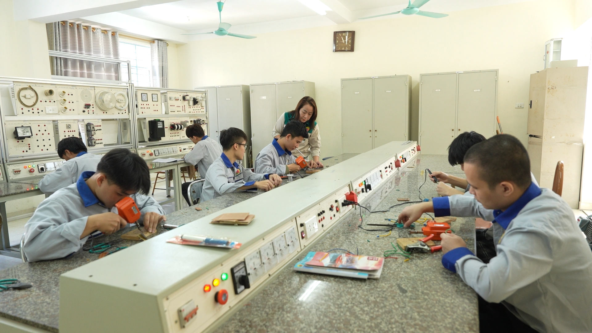 Nhà trường hiện đang đào tạo 19 nghề thuộc nhóm kỹ thuật, kinh tế, công nghệ thông tin và dịch vụ. Trong số đó, các ngành kỹ thuật như Điện công nghiệp, Điện tử công nghiệp, Điện lạnh và một số ngành thuộc khối kinh tế như Thương mại điện tử đang thu hút đông sinh viên đăng ký. Lý do rất rõ ràng: doanh nghiệp hiện nay “khát” nhân lực có tay nghề cao, đặc biệt trong lĩnh vực kỹ thuật. Riêng ngành Thương mại điện tử, sự phát triển nhanh của nền kinh tế số khiến nhu cầu tuyển dụng rất lớn, mang lại nhiều cơ hội việc làm thực tế cho sinh viên.