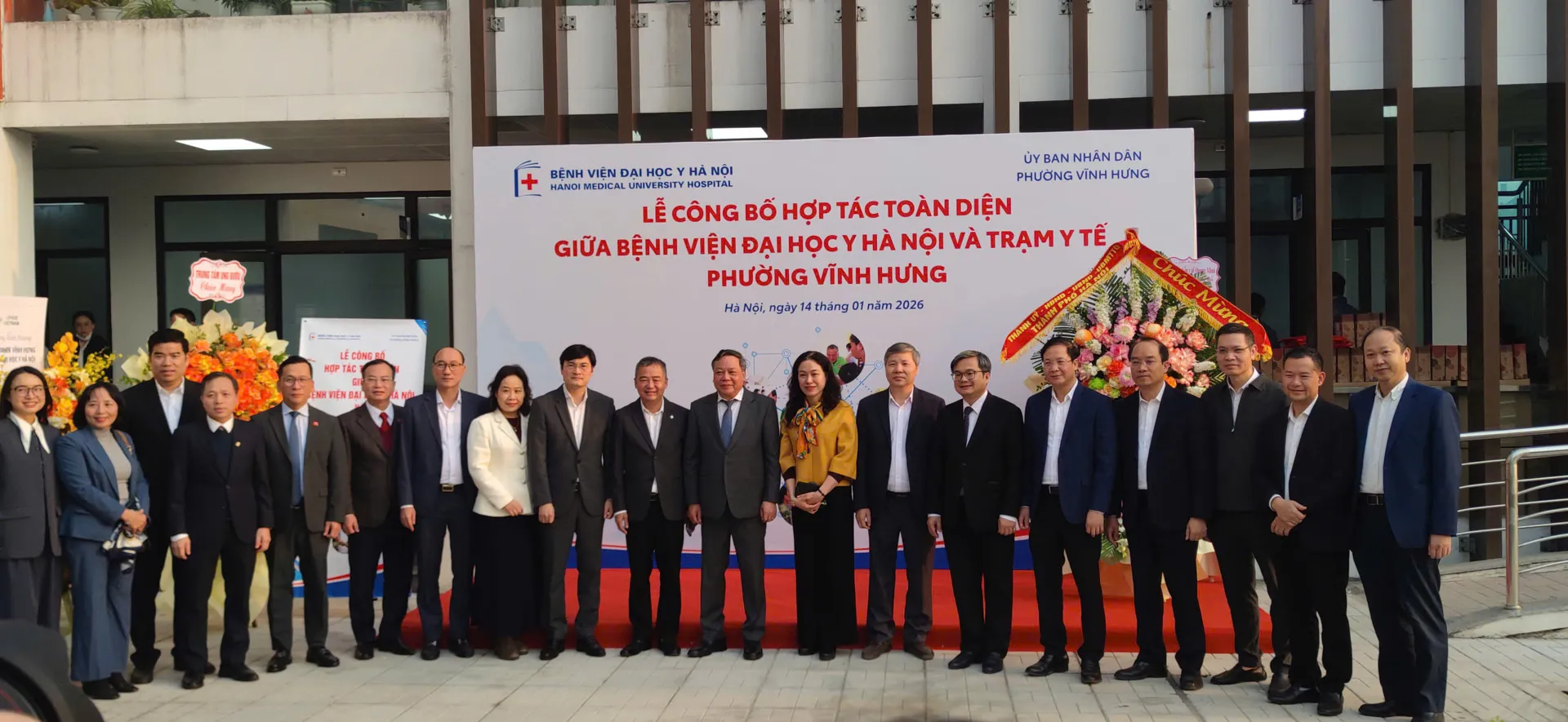 Phó Bí thư Thường trực Thành ủy Hà Nội Nguyễn Văn Phong, PGS.TS.BS Nguyễn Lân Hiếu - Giám đốc Bệnh viện (BV) Đại học Y Hà Nội, các đồng chí lãnh đạo Thành phố, phường Vĩnh Hưng tại Lễ công bố hợp tác toàn diện giữa UBND phường Vĩnh Hưng và BV Đại học Y Hà Nội. Ảnh: An Thanh.