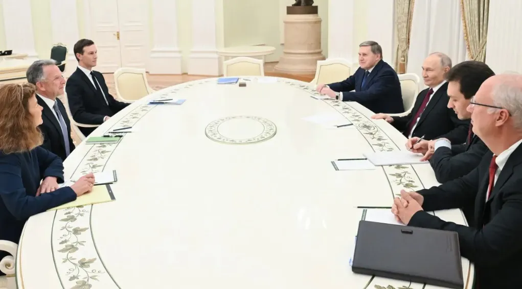 Tổng thống Nga Vladimir Putin trong cuộc họp với đặc phái viên Mỹ Steve Witkoff và Jared Kushner, con rể Tổng thống Mỹ Donald Trump, tại Điện Kremlin nhằm tìm giải pháp chấm dứt chiến sự tại Ukraine ngày 2/12/2025. Ảnh: Anadolu