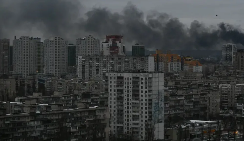 Khói bốc lên trên các tòa nhà dân cư sau các cuộc tấn công bằng máy bay không người lái và tên lửa của Nga ở Kiev, Ukraine. Ảnh: Aljazeera