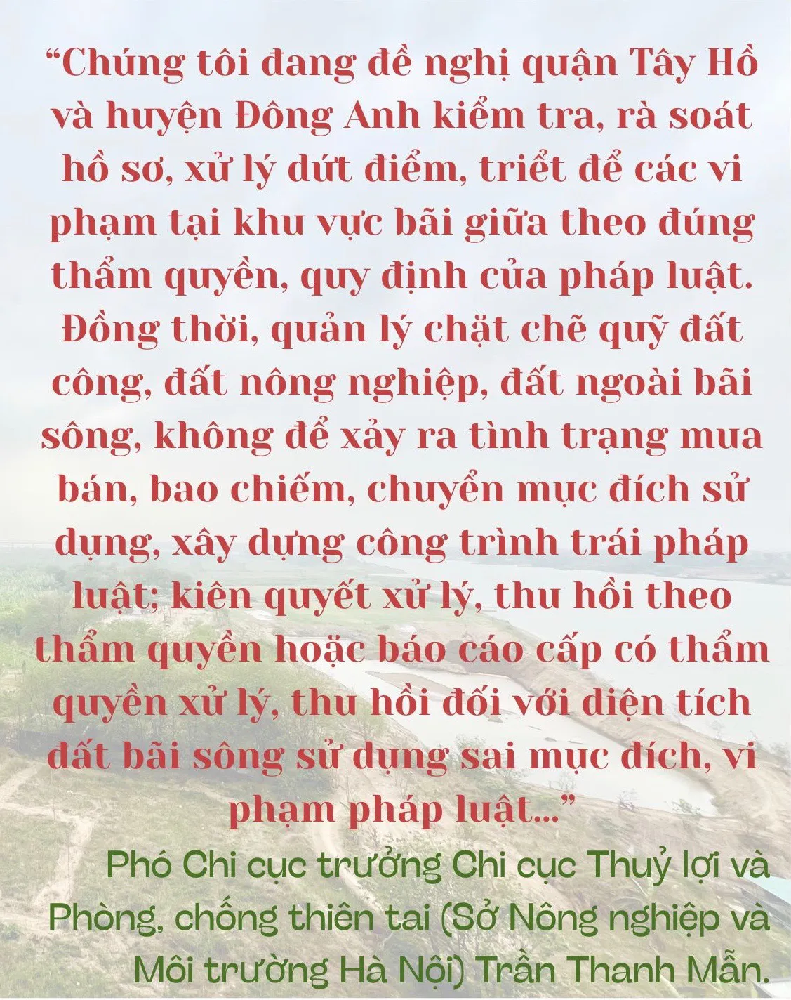 Trước tình trạng vi phạm nghiêm trọng tại khu vực bãi giữa sông Hồng, đề nghị chính quyền các địa phương nêu cao tinh thần trách nhiệm, quyết liệt vào cuộc, sớm giải toả triệt để các hành vi vi phạm làm “biến dạng” bãi giữa sông Hồng; đồng thời, xử lý nghiêm các đối tượng trên tinh thần thượng tôn pháp luật; tuyệt đối không bao che để xảy ra tham nhũng, tiêu cực, lãng phí.