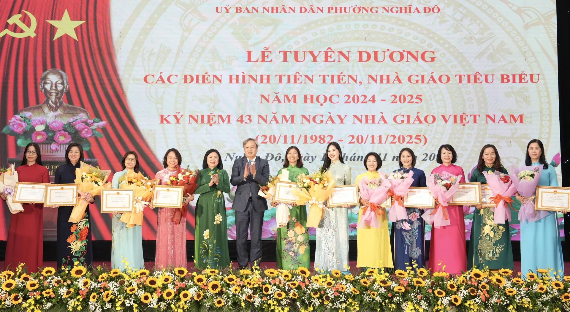 Bên cạnh thành tích tập thể, phường Nghĩa Đô cũng vinh danh nhiều nhà giáo tiêu biểu có đóng góp sâu sắc như: Tiến sĩ Nguyễn Văn Hòa – Chủ tịch HĐ Trường THCS-THPT Nguyễn Bỉnh Khiêm – được trao danh hiệu “Công dân ưu tú Thủ đô”. Nhà giáo ưu tú Vũ Ngọc Dự – Hiệu trưởng Mầm non Ánh Sao – nhận Huân chương Lao động hạng Nhì. Nhà giáo Nguyễn Thị Như Quỳnh (Mầm non Hoa Hồng) và Nhà giáo Hà Thị Thanh Bình (Mầm non Quan Hoa) nhận Huân chương Lao động hạng Ba. Nhà giáo Trương Thị Thu Hiền – Hiệu trưởng THCS Nghĩa Tân – và Nhà giáo Nguyễn Thị Dung – giáo viên Mầm non Hoa Hồng – nhận Bằng khen Thủ tướng Chính phủ.