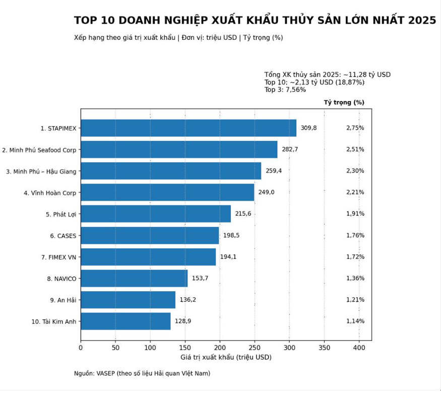 Theo Hiệp hội Chế biến và Xuất khẩu thủy sản Việt Nam (Vasep), tổng kim ngạch xuất khẩu thủy sản của Việt Nam năm 2025 đạt khoảng 11,35 tỷ USD, tăng 13,1% so với cùng kỳ năm ngoái.