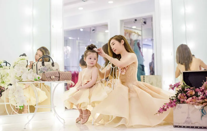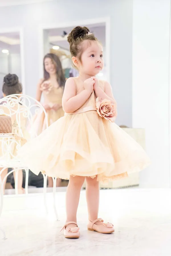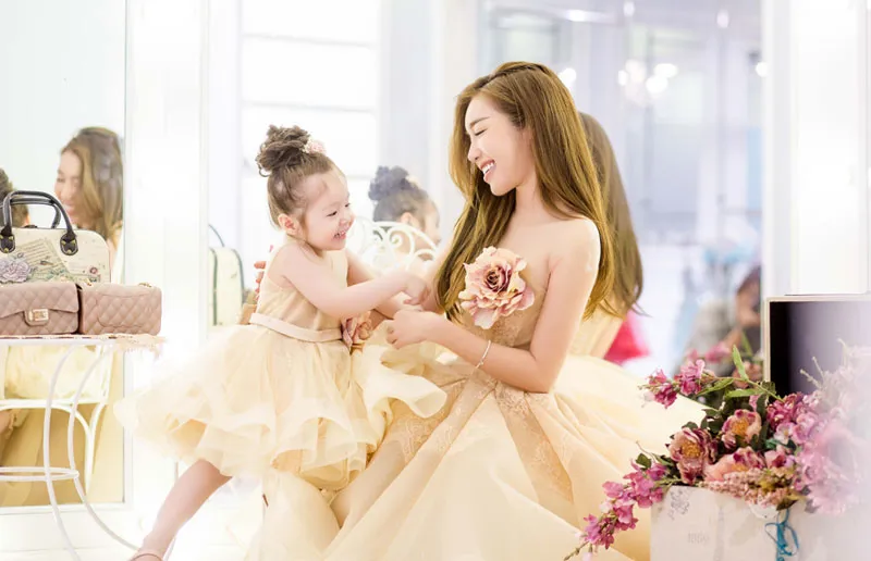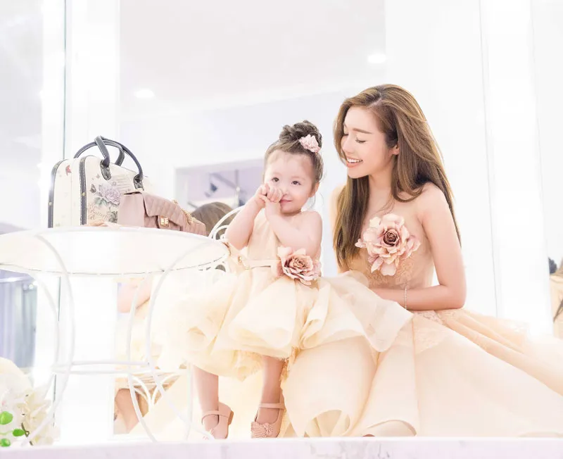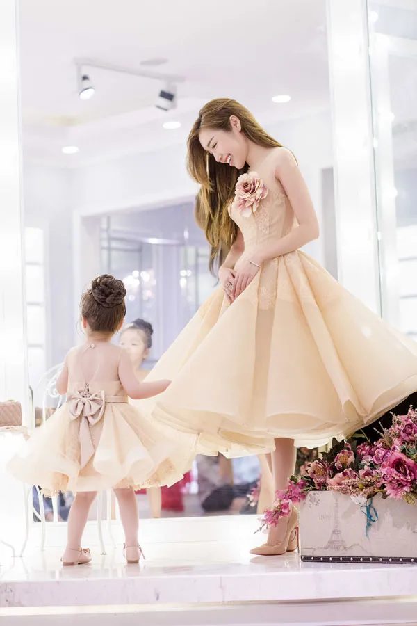 Trong hậu trường, Cadie Mộc Trà vô cùng đáng yêu trong trang phục “ton sur ton” với mẹ. Từ kiểu dáng xòe bồng, chất liệu pha lẫn đục và trong đến từng họa tiết trên bộ váy do nhà thiết kế (NTK) Phạm Đăng Anh Thư thực hiện đều có nét tương đồng.