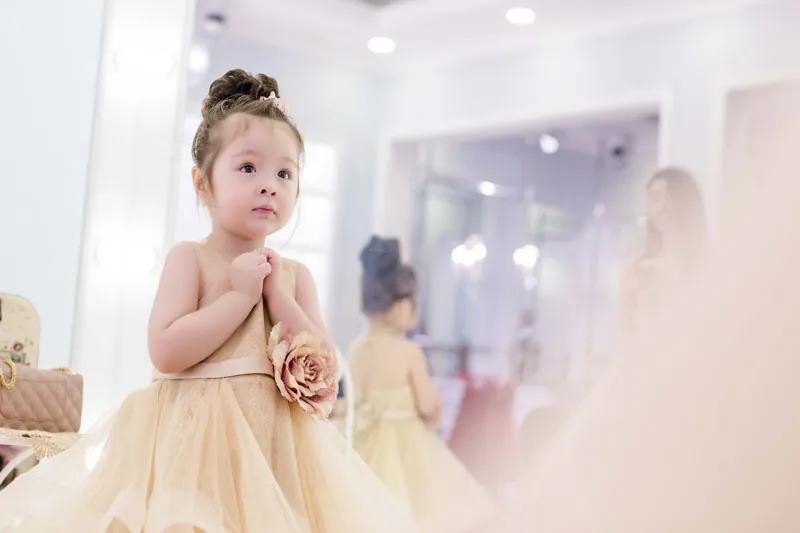 Khi được diện váy giống mẹ, Cadie trông như một phiên bản nhí của mẹ Elly Trần và cô tỏ ra khá thích thú với ngoại hình. Chính điều này giúp bà mẹ hai con yên tâm tạo dáng, bộ ảnh thực hiện rất nhanh chóng.