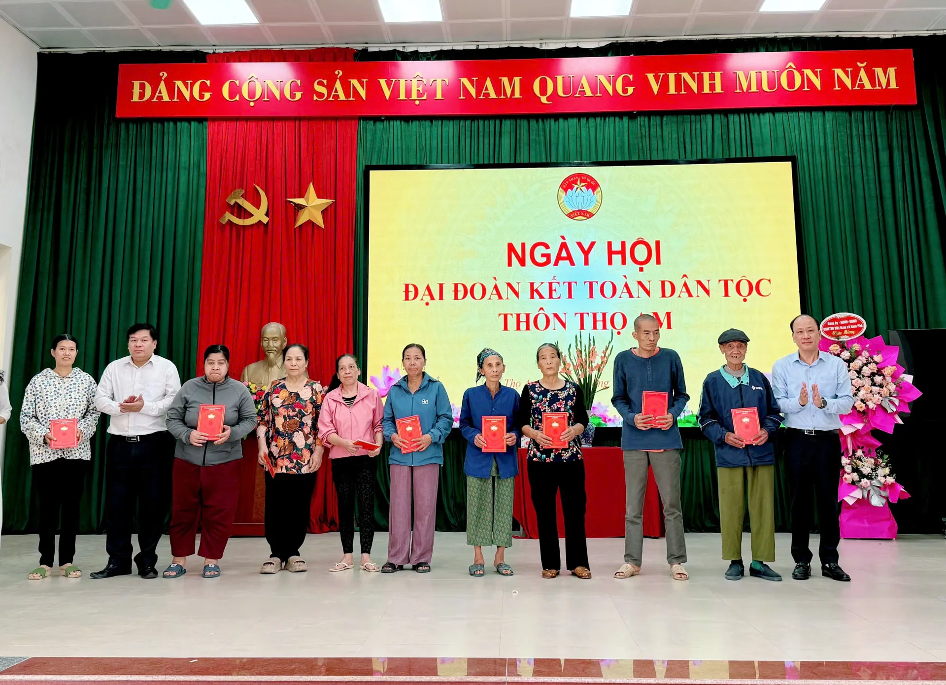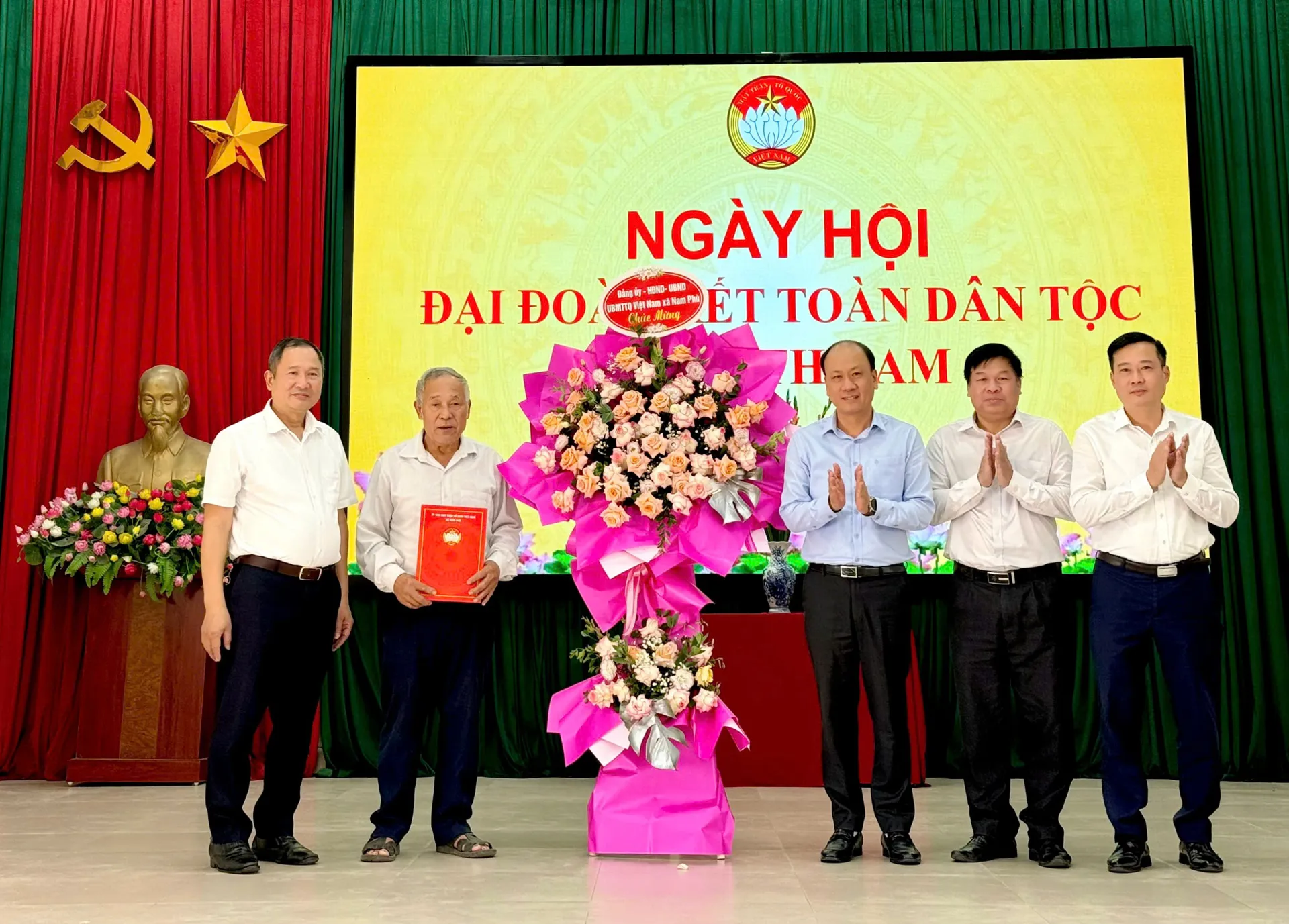 Lãnh đạo xã Nam Phù tặng hoa chúc mừng Ngày hội Đại đoàn kết toàn dân tộc tại thôn Thọ Am.