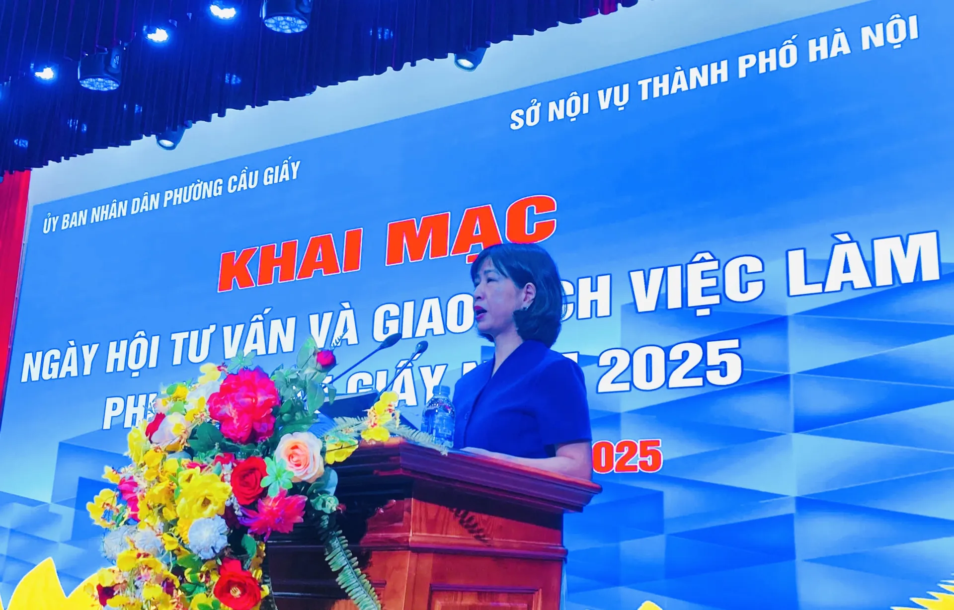 Phó Chủ tịch UBND phường Cầu Giấy Nguyễn Thị Thu Hà phát biểu khai mạc Ngày hội Tư vấn và giao dịch việc làm phường Cầu Giấy năm 2025.