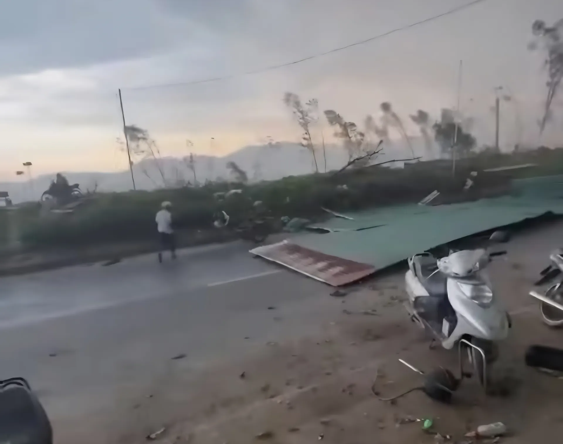 "Đang điều khiển xe máy chạy trên quốc lộ 1A đoạn qua xã Nghi Lộc (Nghệ An) trong mưa thì gió quật mạnh, bất ngờ từ trên cao một mái tôn rơi sập xuống đường, tôi khá hoảng loạn, vứt xe bỏ chạy vào lề đường, ngoảnh lại thấy gió lốc quật bay mái tôn rơi chắn đường quốc lộ" - Chị Vân một người đi đường thông tin.