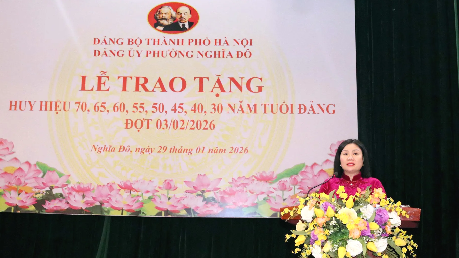 Phát biểu tại buổi lễ, Phó Bí thư Thường trực Đảng ủy phường Nghĩa Đô Nguyễn Thị Thanh nhấn mạnh: Đây là sự kiện có ý nghĩa chính trị sâu sắc, thể hiện sự trân trọng, ghi nhận của Đảng đối với quá trình phấn đấu, rèn luyện bền bỉ, tinh thần trung kiên, tận tụy và những đóng góp to lớn của các đồng chí đảng viên trong suốt nhiều năm, nhiều thập kỷ cống hiến cho sự nghiệp cách mạng của Đảng, của dân tộc và của địa phương.