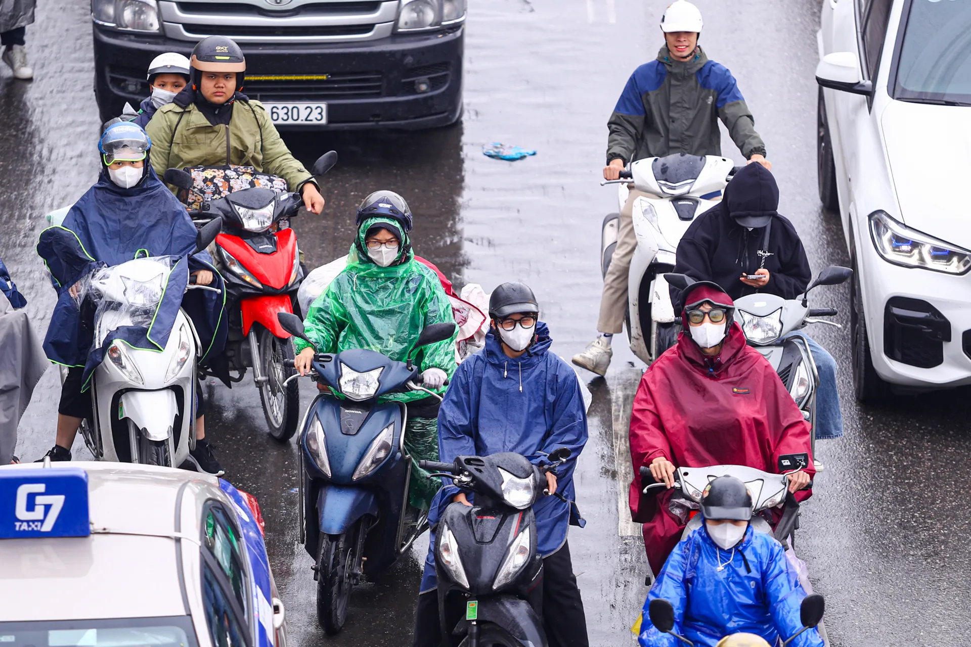 Trong cơn mưa phùn kéo dài, việc đi lại của người dân càng thêm vất vả, nhiều phương tiện phải di chuyển chậm để đảm bảo an toàn.