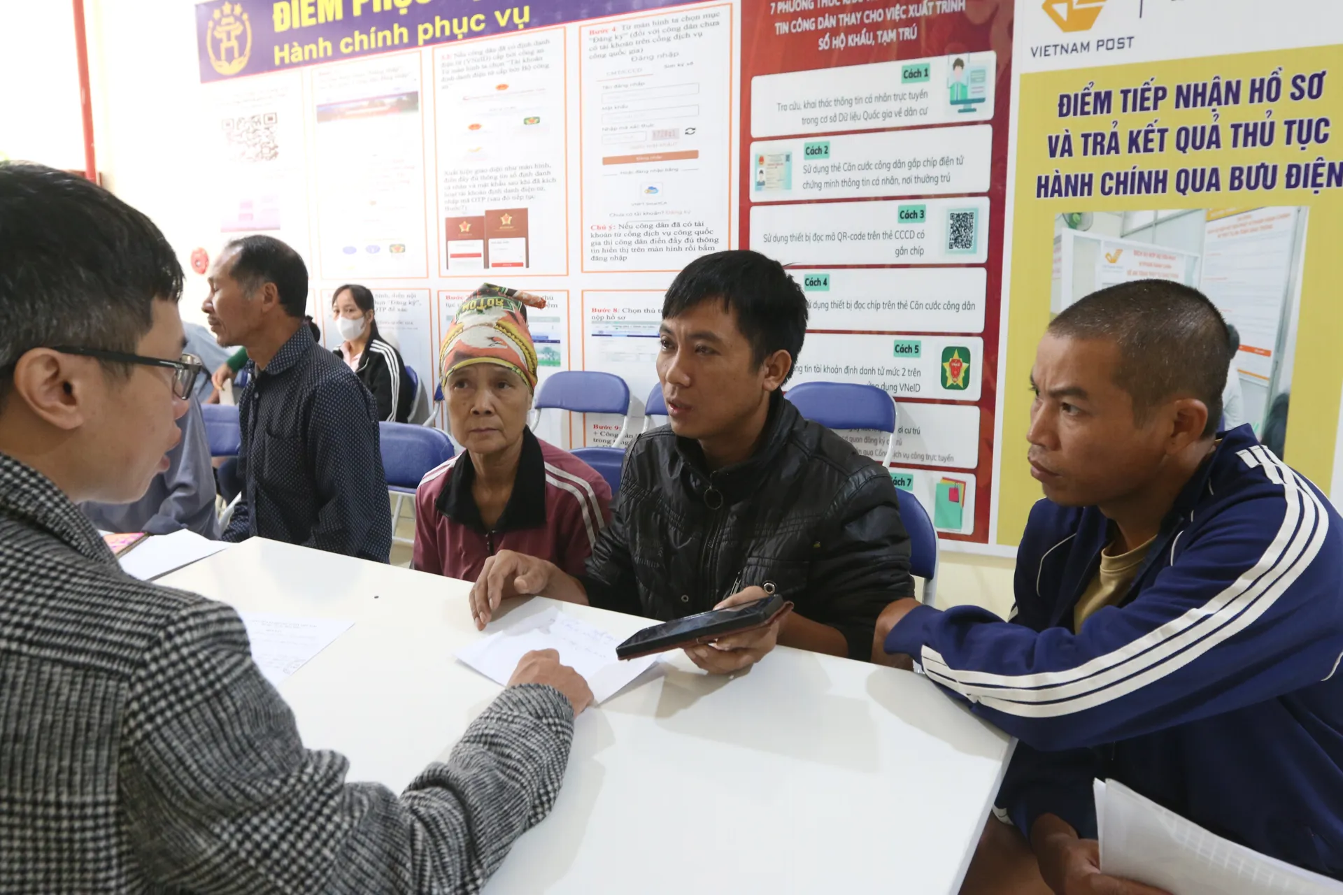 Gia đình bà Nguyễn Thị Chanh lên điểm phục vụ Mô hình “Dịch vụ công lưu động” để hỏi về làm sổ đỏ lần đầu với đất đổi cho xã làm nhà văn hóa. Ảnh: Công Phương.