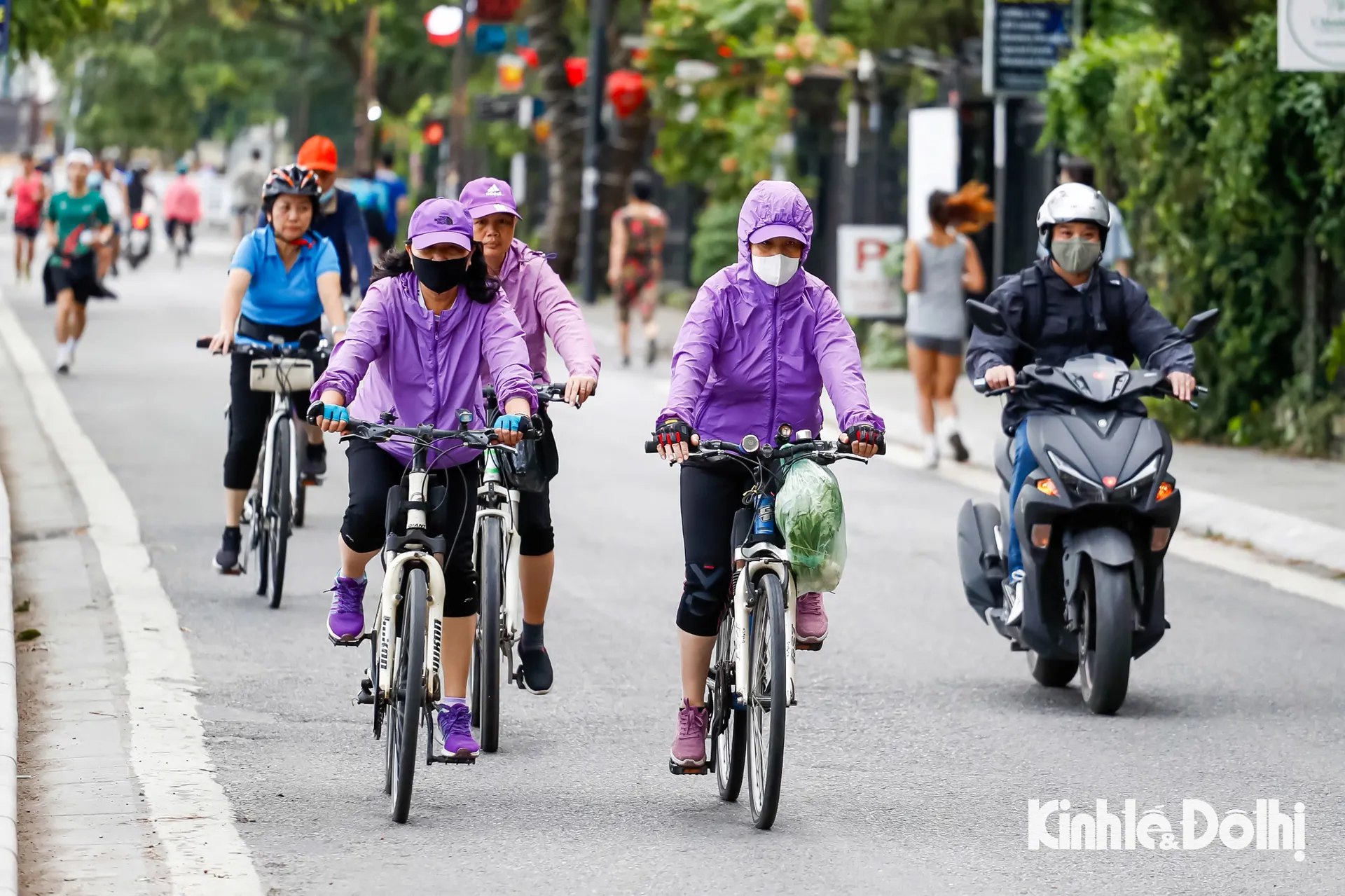 Người dân thong thả đạp xe quanh hồ Tây, tận hưởng không khí trong lành của ngày đầu lạnh.