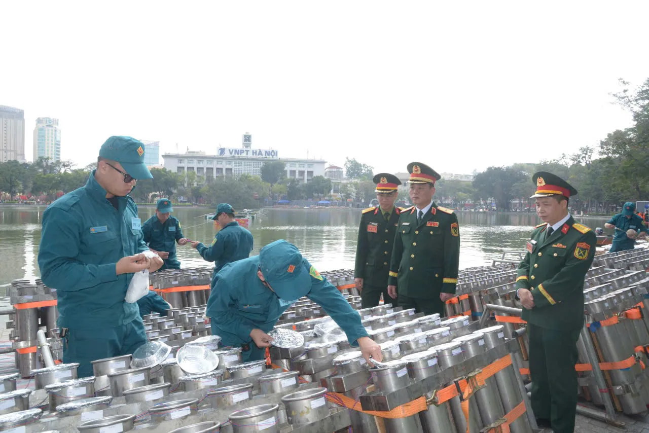 Bộ Tư lệnh Thủ đô Hà Nội kiểm tra công tác chuẩn bị bắn pháo hoa tại hồ Hoàn Kiếm. Ảnh: Văn Luân.