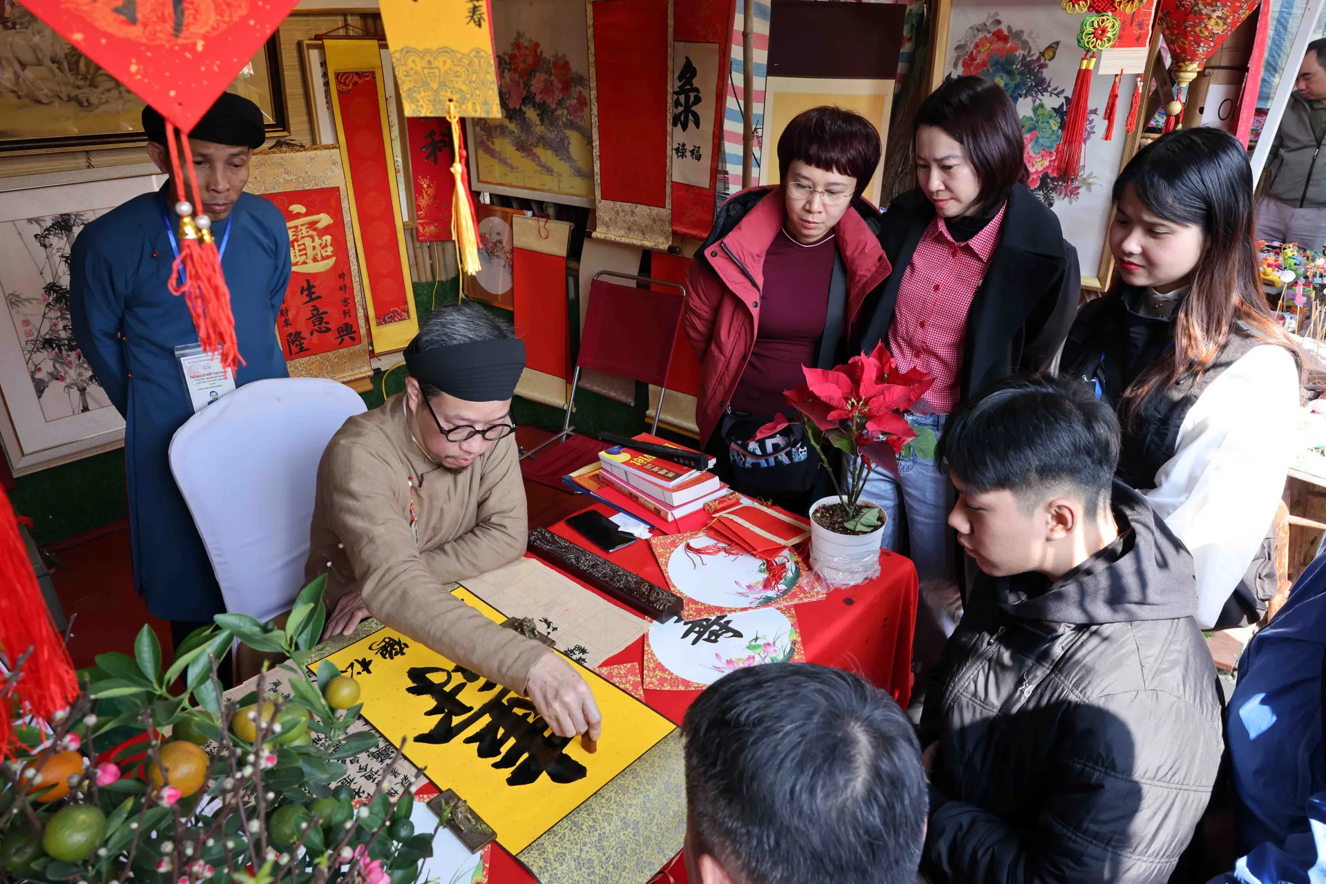 Đối diện với khu nội tự của Văn Miếu - Quốc Tử Giám, khu vực hồ Văn cũng rộn ràng với Hội chữ Xuân Giáp Thìn. 40 ông đồ được khảo tuyển kỹ lưỡng đã mang đến Hội chữ những bức thư pháp đẹp và viết chữ cho người dân có nhu cầu. Em Phạm Quang Hưng (Đống Đa, Hà Nội) chia sẻ: "Năm học này là năm quan trọng đối với em, bởi vậy, sáng mùng 1 Tết, em được bố mẹ đưa tới đây để xin chữ mong việc học hành, thi cử sẽ thuận lợi”. Trung tâm Hoạt động Văn hóa khoa học Văn Miếu - Quốc Tử Giám thông tin, tính trong 4 ngày nghỉ Tết (từ mùng 1 đến mùng 4 tháng Giêng), khu di tích quốc gia đặc biệt này đã đón khoảng 90.000 lượt khách tham quan.