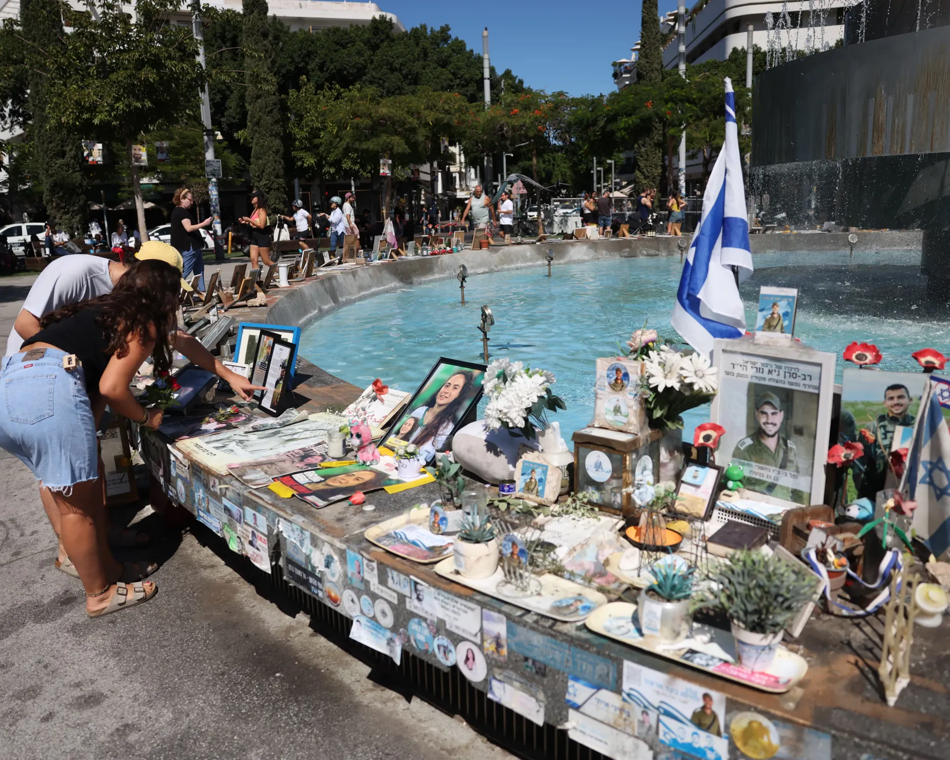 Người dân tại Quảng trường Dizengoff ở Tel Aviv đặt hoa và di ảnh nạn nhân tại đài tưởng niệm các nạn nhân Israel trong vụ tấn công ngày 7/10 năm 2023. Ảnh: Abir Sultan/EPA