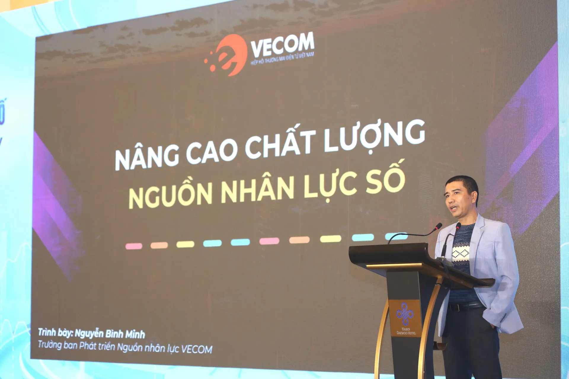 Ths Nguyễn Bình Minh - Trưởng ban phát triển nguồn nhân lực, Hiệp hội Thương mại điện tử Việt Nam (VECOM) chia sẻ tại diễn đàn. Ảnh: Phạm Hùng