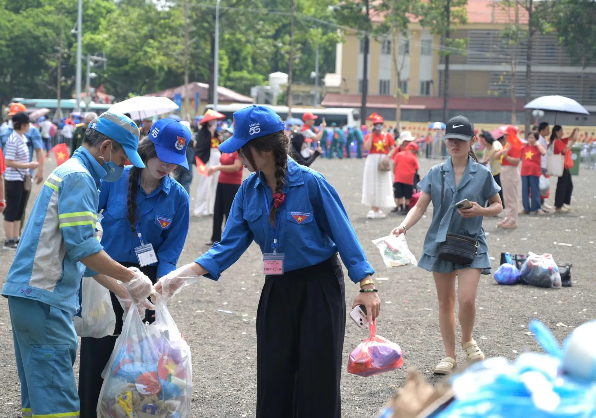 Đáng ghi nhận, cùng với màu áo xanh của đội ngũ công nhân, sắc áo xanh tình nguyện cũng phủ khắp các tuyến đường, con phố sau lễ diễu binh, diễu hành. Hàng ngàn sinh viên tình nguyện đã tham gia dọn dẹp vệ sinh môi trường sau Đại lễ. Dù có vất vả trong tiết trời nắng nóng, tuy nhiên các bạn trẻ đều tỏ ra vui vẻ và nhiệt tình thu dọn rác thải phát sinh trên đường phố.