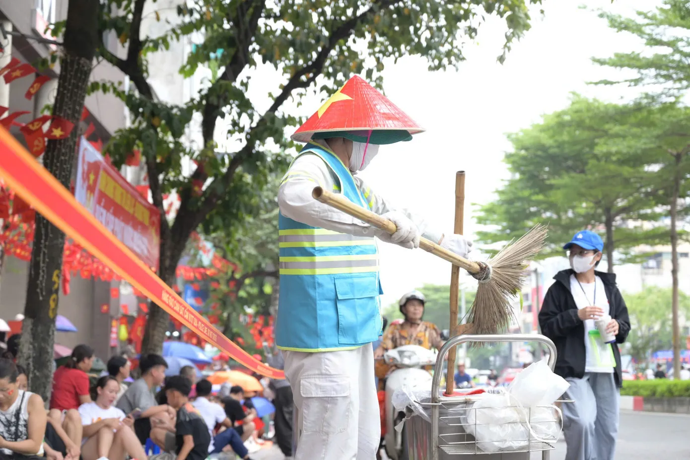 Giữa dòng người đông đúc, chị Nguyễn Thị Hiền - công nhân Công ty TNHH MTV Môi trường Đô thị (Urenco) vẫn đều tay quét dọn, thu gom từng túi rác để phố phường gọn gàng, sạch đẹp. Với chị, đây là một ca làm đặc biệt, bởi vừa là trách nhiệm nghề nghiệp, vừa là niềm vinh dự khi được góp phần nhỏ bé cho ngày trọng đại của đất nước.