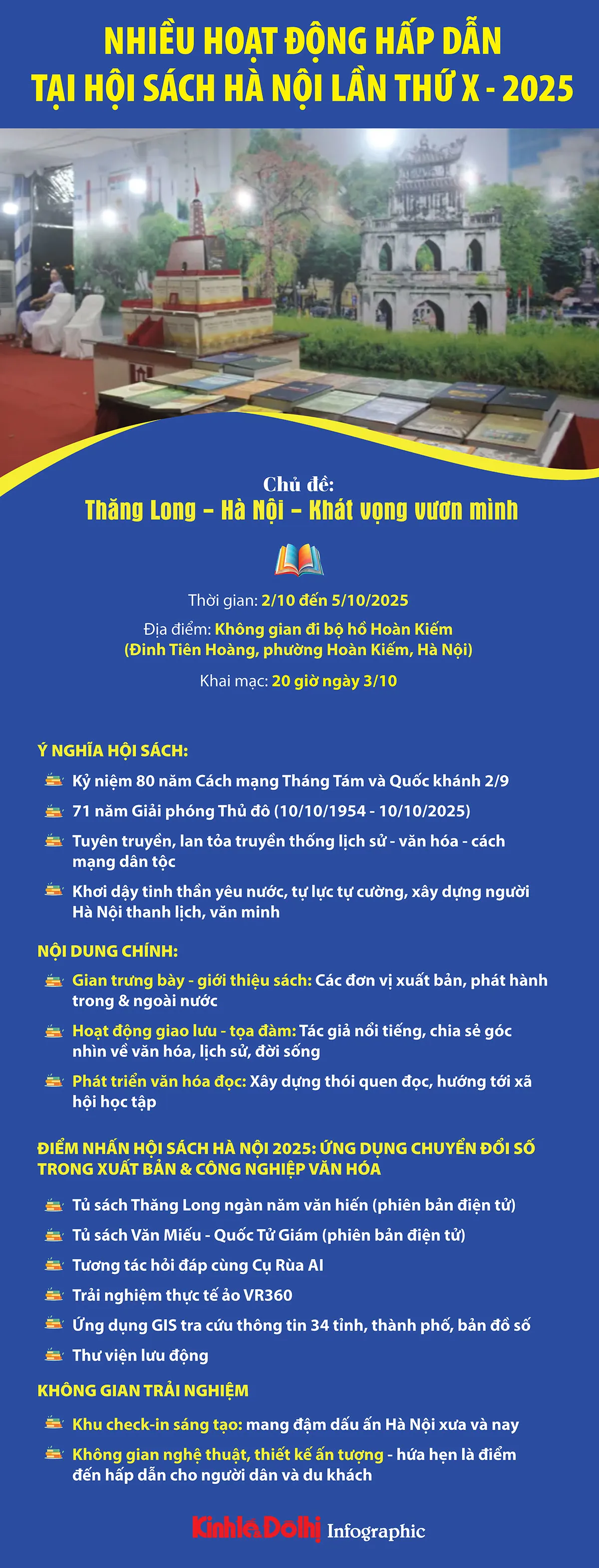 Kinhtedothi - Hội sách Hà Nội lần thứ X do UBND TP Hà Nội chỉ đạo, Sở Văn hóa và Thể thao Hà Nội thực hiện, là hoạt động thiết thực kỷ niệm 80 năm Cách mạng Tháng Tám thành công (19/8/1945 - 19/8/2025) và Quốc khánh nước Cộng hòa xã hội chủ nghĩa Việt Nam (2/9/1945 - 2/9/2025), 71 năm Ngày Giải phóng Thủ đô (10/10/1954 - 10/10/2025).