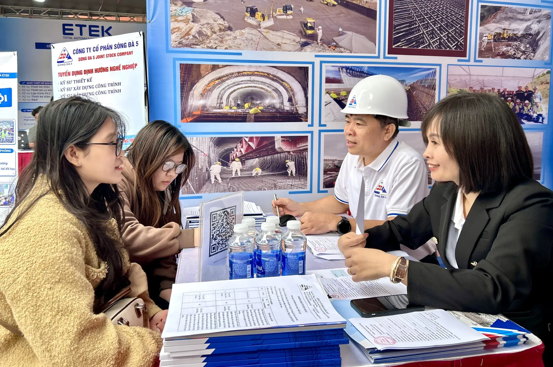 Trao đổi về nhu cầu tuyển dụng năm 2026, ông Lê Thanh Sơn – Chủ tịch Công đoàn, Phó Phòng Hành chính – Nhân sự Công ty CP Sông Đà 5 cho hay: Chúng tôi đang cần rất nhiều sinh viên sắp ra trường và đã tốt nghiệp để làm việc cho 8 dự án trong nước và tại Lào. Các vị trí cần tuyển bao gồm kỹ sư, công nhân xây lắp, công nhân cơ khí, lái xe, thợ điện và nhân sự quản lý. Công ty áp dụng các chính sách như: hỗ trợ tiền xe, chỗ ở, bữa ăn tập thể và trang bị đầy đủ bảo hộ lao động...