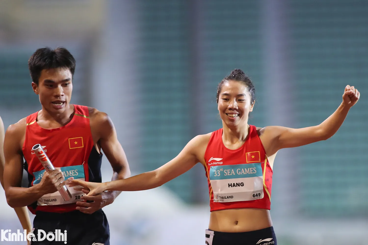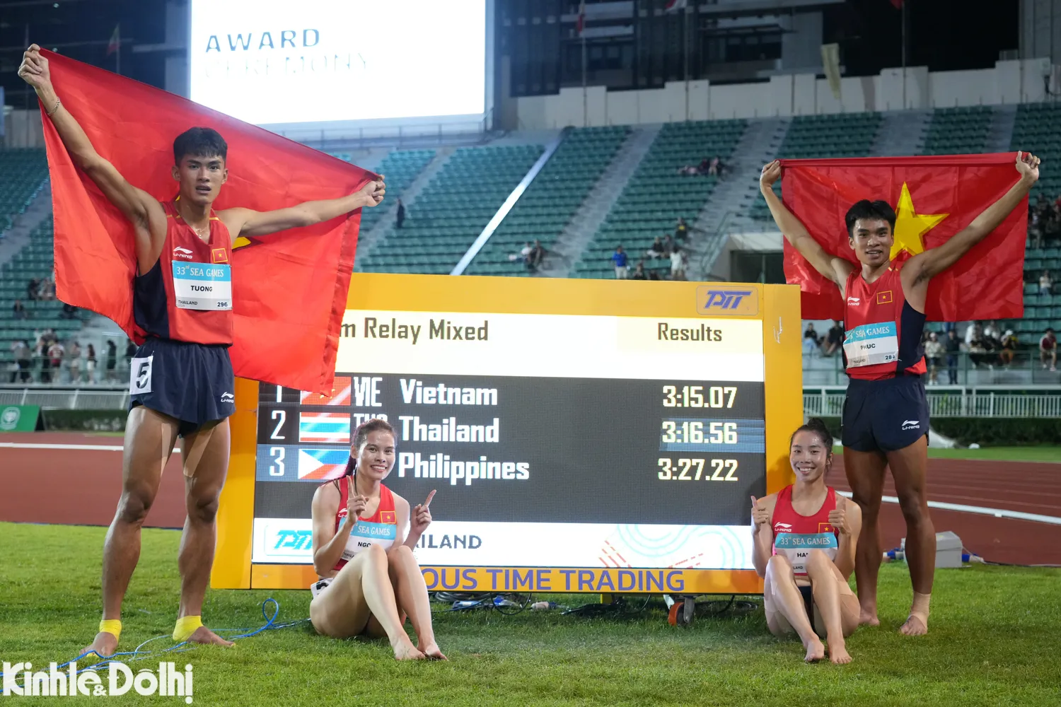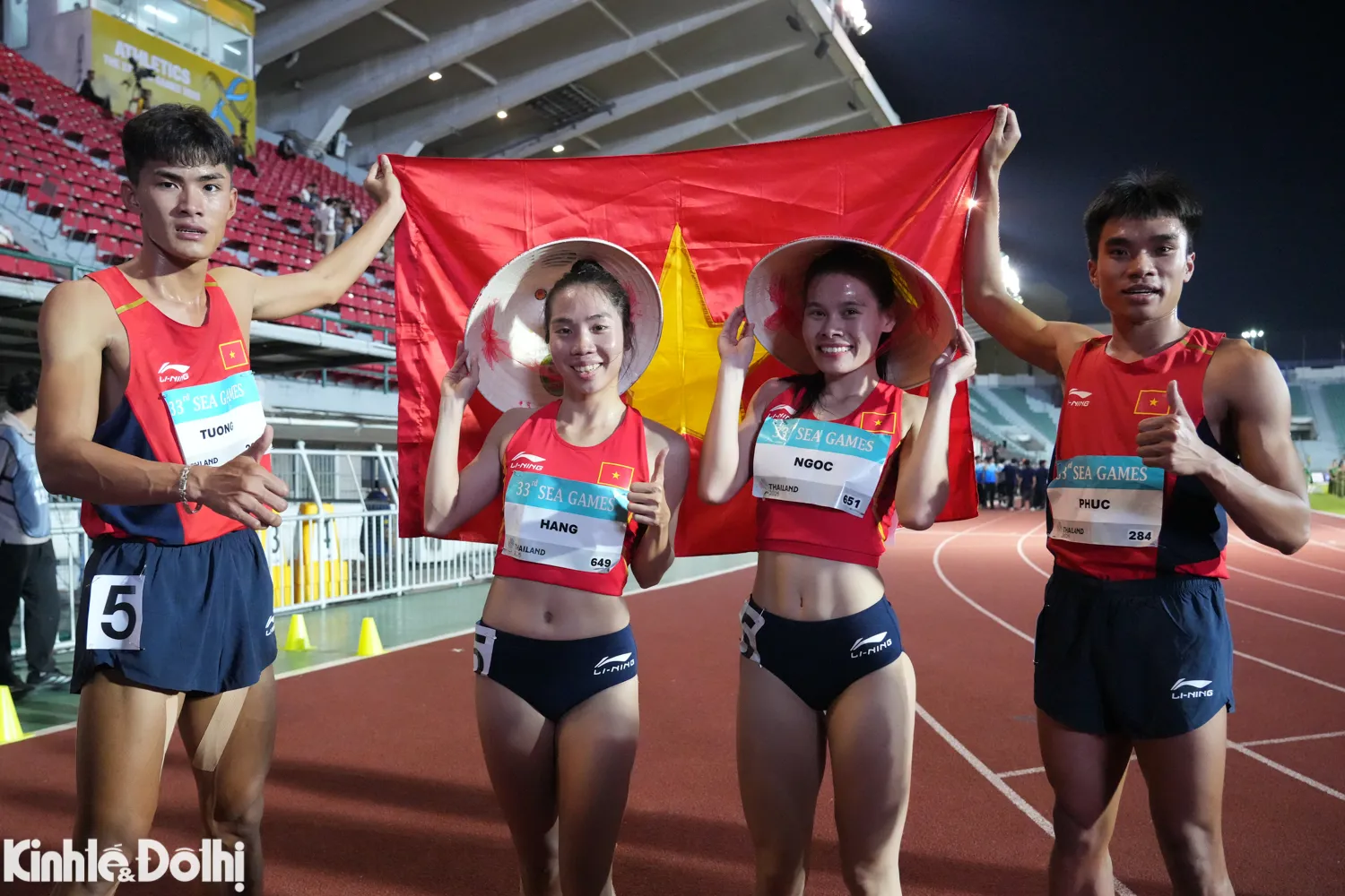 Kinhtedothi - Trong ngày thi đấu 13/12 tại SEA Games 33, Đoàn Thể thao Việt Nam giành 6 HCV từ các môn karate, teakwondo và điền kinh. Trong đó, 4 vận động viên điền kinh Việt Nam là Lê Ngọc Phúc, Nguyễn Thị Hằng, Nguyễn Thị Ngọc, Tạ Ngọc Tưởng phá kỷ lục SEA Games với thành tích 3 phút 15 giây 07 (so với kỷ lục cũ 3 phút 19 giây 29) ở nội dung tiếp sức 4x400m hỗn hợp.