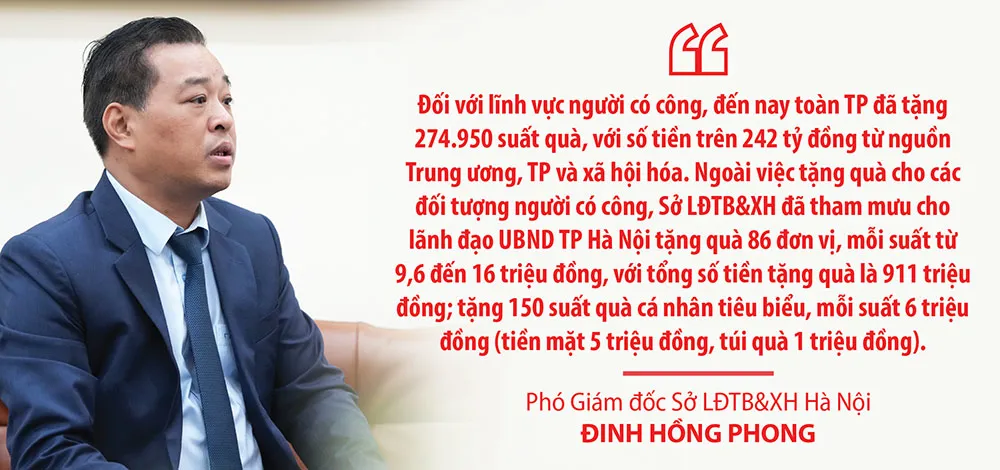 Đối với huyện Đông Anh, công tác tặng quà và chăm lo cho các đối tượng nhân dịp Tết Nguyên đán Giáp Thìn 2024 đã được sự quan tâm chỉ đạo quyết liệt từ huyện đến sơ sở, Trưởng phòng LĐTB&XH huyện Đông Anh Nguyễn Đình Thanh cho biết: Tính đến ngày 29/1/2024, huyện Đông Anh đã tặng 50.677 suất quà với từ nguồn ngân sách với tổng kinh phí 26.116.500.000 đồng cho các đối tượng chính sách người có công, hộ cận nghèo, đối tượng bảo trợ xã hội, hưu trí, mất sức lao động. Cùng với đó, huyện vận động các DN, tổ chức và cá nhân ủng hộ 2.895.000.000 đồng và 4.718 suất quà bằng tiền mặt được trao cho các đối tượng, trong đó 540 suất quà trị giá 1.000.000 đồng/suất, 4.178 suất quà trị giá 500.000 đồng/suất. Các xã, thị trấn vận động và trao quà cho các hộ khó khăn 1.825 suất quà trị giá 912.500.000 đồng.