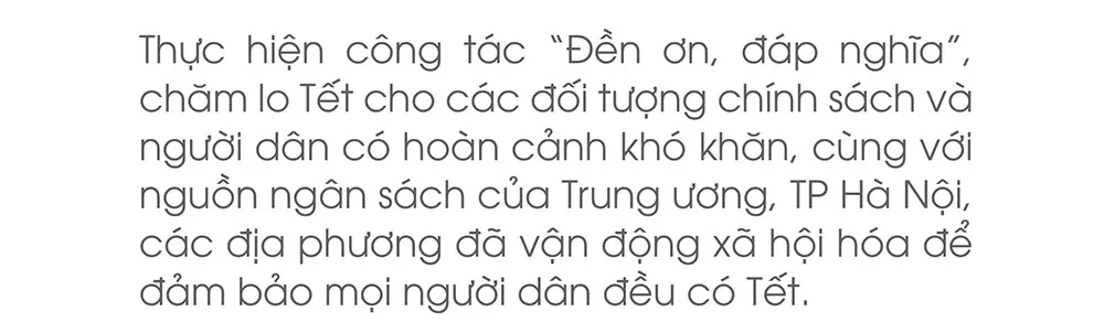 Trong dịp Tết Nguyên đán Giáp Thìn 2024, thực hiện chỉ đạo của Thành ủy, UBND TP Hà Nội, các quận, huyện trên địa bàn Thủ đô đã sớm ban hành kế hoạch thăm hỏi, tặng quà các đối tượng do Trung ương, TP quy định. Năm nay điều kiện kinh tế - xã hội có nhiều khó khăn nên để đảm bảo an sinh xã hội, không để bất kỳ người dân nào không có Tết, các địa phương đã tích lũy và huy động thêm nguồn lực để chăm lo Tết cho người dân có hoàn cảnh khó khăn.