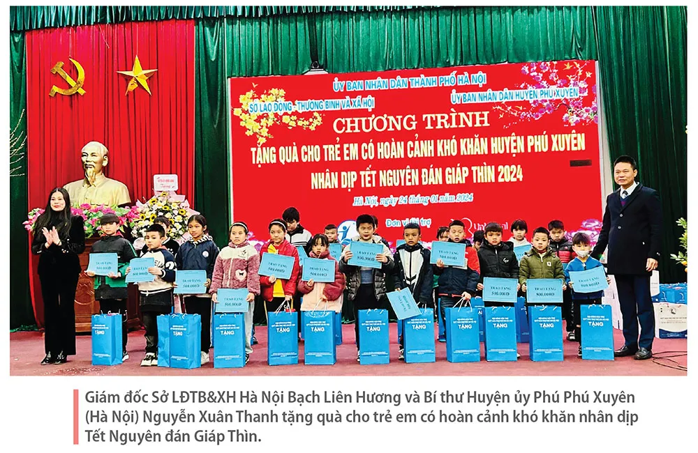 Với mong muốn mọi trẻ em được đón Tết Giáp Thìn ấm áp, yêu thương, Sở LĐTB&XH Hà Nội đã tặng quà cho trẻ em có hoàn cảnh khó khăn của các huyện Mỹ Đức, Phú Xuyên, Phúc Thọ, Ứng Hòa, Ba Vì, phường Nguyễn Trãi (quận Hà Đông), Trung tâm Bảo trợ xã hội 3 Hà Nội, Trung tâm Chăm sóc người khuyết tật Hà Nội với tổng số 571 suất quà trị giá 475.857.000 đồng. Cháu nguyễn Thị Bích Phương là học sinh lớp 5 Trường Tiểu học Phú Yên (huyện Phú Xuyên) rất vui khi được nhận 2 túi quà và 500.000 đồng tiền mặt phấn khởi cho biết: Cháu sẽ mời mọi người trong nhà ăn bánh và để dành đến Tết; đưa bà nội 500.000 đồng để đóng học.