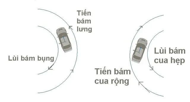 Quy tắc tiến bám lưng lùi bám bụng được áp dụng khi lái xe, quay xe, lùi xe trong không gian nhỏ hẹp hay có vật chắn hai bên đường hoặc ở những đoạn đường đèo dốc có nhiều khúc cua khúc khuỷu.