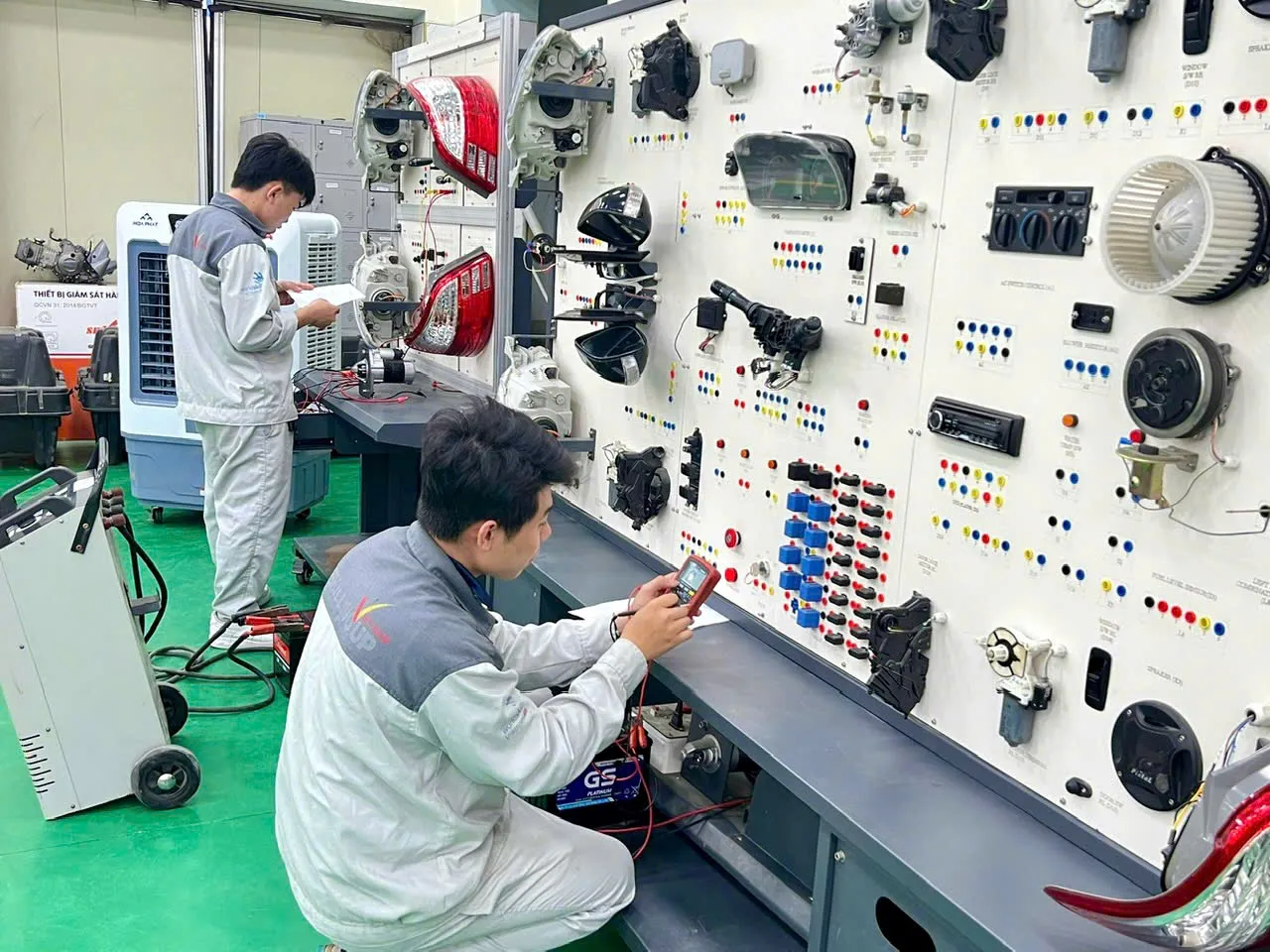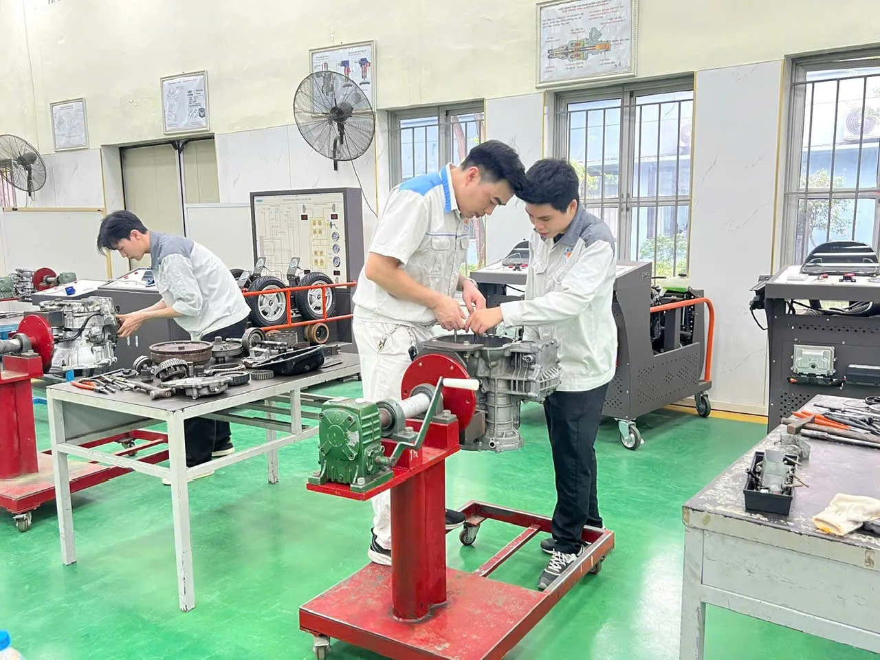 Sinh viên Trường Cao đẳng nghề Công nghiệp Hà Nội đang được giáo viên hướng dẫn thực hành nghề Công nghệ ô tô.
