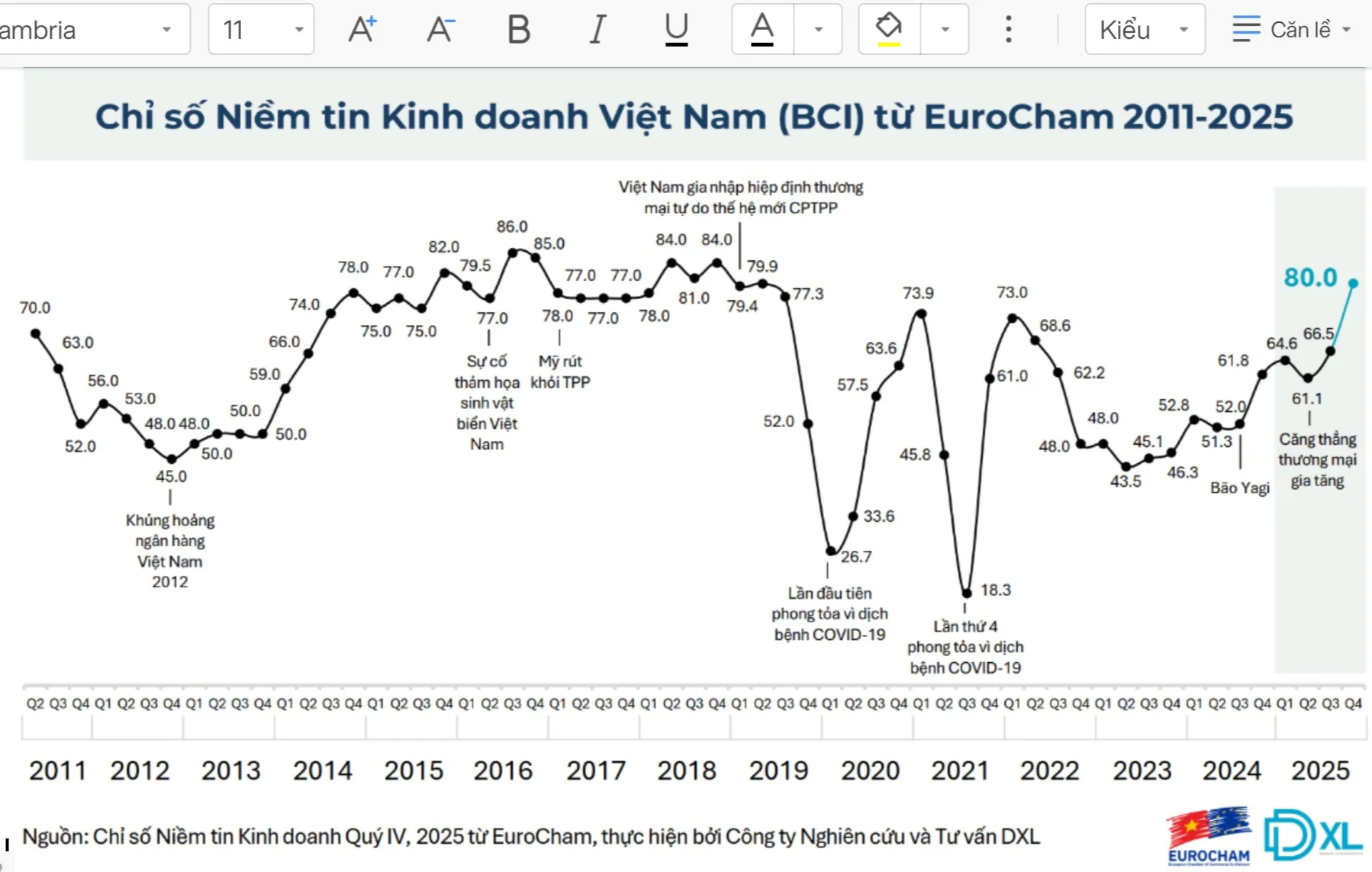 Diễn biến này phản ánh sát sao quỹ đạo phục hồi và tăng tốc của kinh tế vĩ mô của Việt Nam. Tăng trưởng GDP trong quý IV/2025 đạt 8,46% (mức tăng trưởng hàng quý nhanh nhất kể từ quý IV/2007), đồng thời vượt trên dự báo của nhiều tổ chức quốc tế lớn. Ông Bruno Jaspaert - Chủ tịch EuroCham nhận định, sau nhiều năm dao động quanh ngưỡng trung lập, việc đạt mốc 80 cho thấy niềm tin hiện không mang tính kỳ vọng đơn thuần, mà được củng cố bằng thực tế: nhà máy duy trì hoạt động ổn định, đơn đặt hàng đang dần phục hồi và các quyết định đầu tư đang được triển khai. Việt Nam đang bước vào một giai đoạn chuyển dịch mang tính cấu trúc, từng bước khẳng định vai trò là một động lực tăng trưởng chủ chốt, trên lộ trình vươn lên nhóm ba nền kinh tế hàng đầu ASEAN.